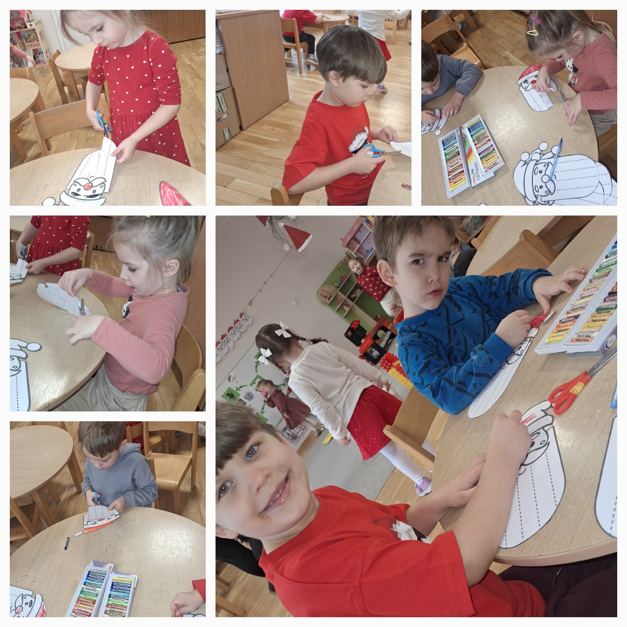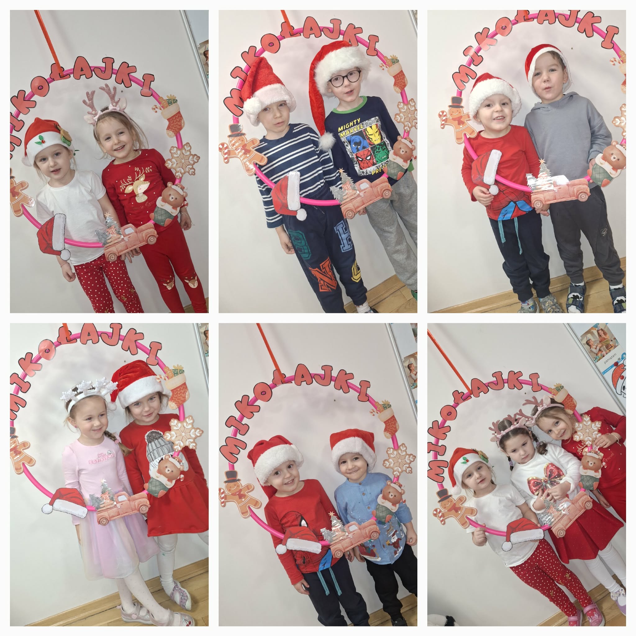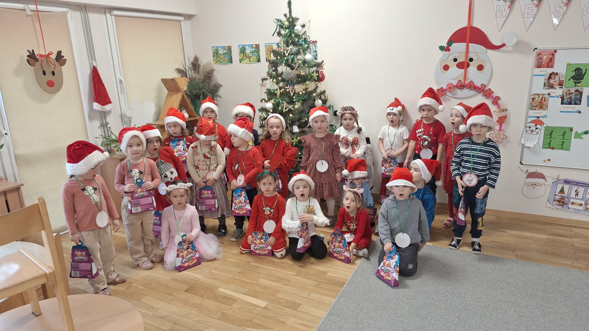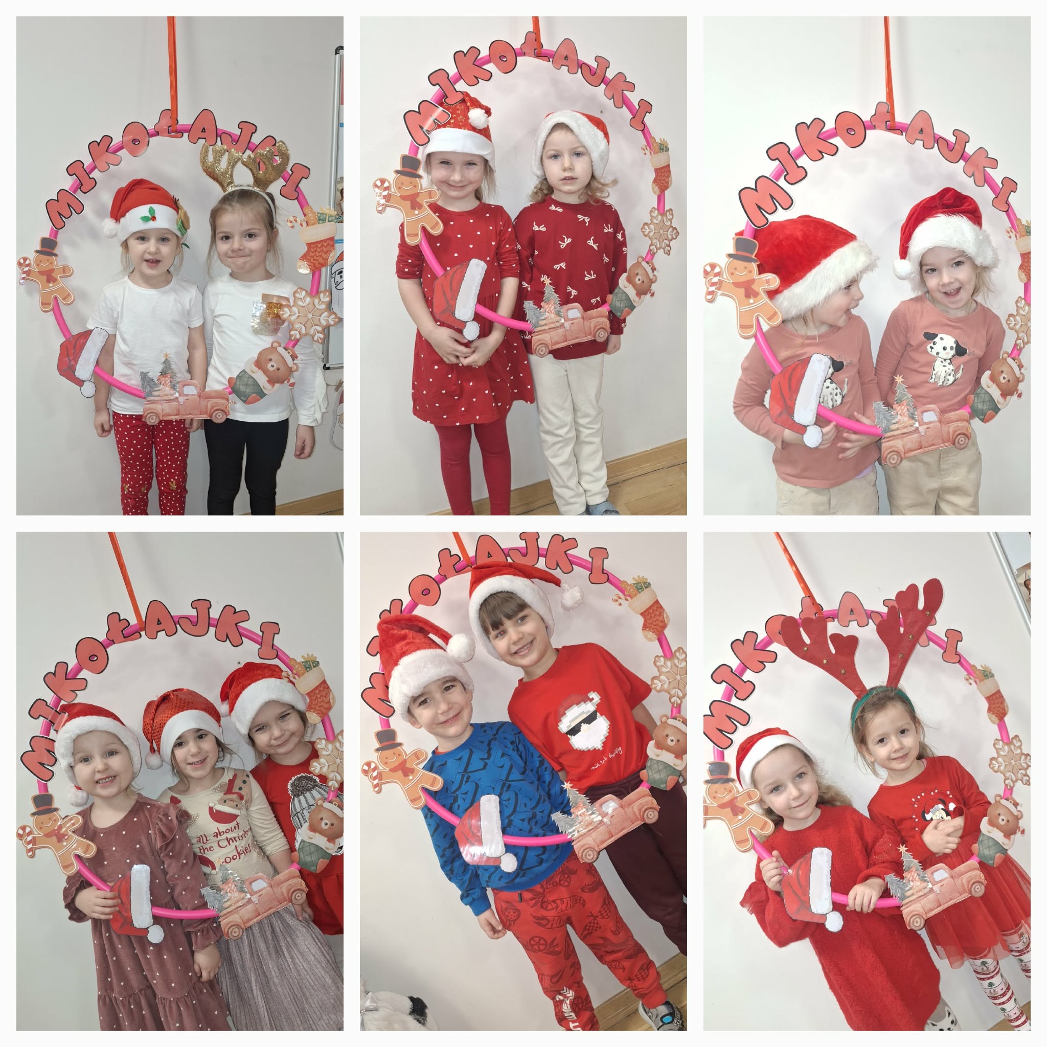 Mikołajki to dzień, na który dzieci czekają z niecierpliwością. W tym dniu nasze przedszkolaki zamieniły się w pomocników Mikołaja i przyszły do przedszkola w czerwonych strojach oraz czapeczkach. Na przedszkolaków tego dnia pod choinką czekały słodkie upominki, które podrzucił sam Święty Mikołaj – pozostawiając ślady butów na podłodze i okruszki po zjedzonym ciasteczku i pustej szklanki po wypitym mleku. Przedszkolaki tego dnia śpiewały piosenkę o Mikołaju, brały udział w zabawach ruchowych, wykonały prace plastyczne ćwicząc przy tym cięcie nożyczkami. Dzieci segregowały papierowe prezenty, nazywały ilustracje z nazwami zabawek. Wieszały pranie Mikołaja. Na koniec zjadły słodką przekąskę w postaci jabłka oraz pierniczków, które zostawił dla nich Święty Mikołaj. To był wspaniały, pełen radości dzień.