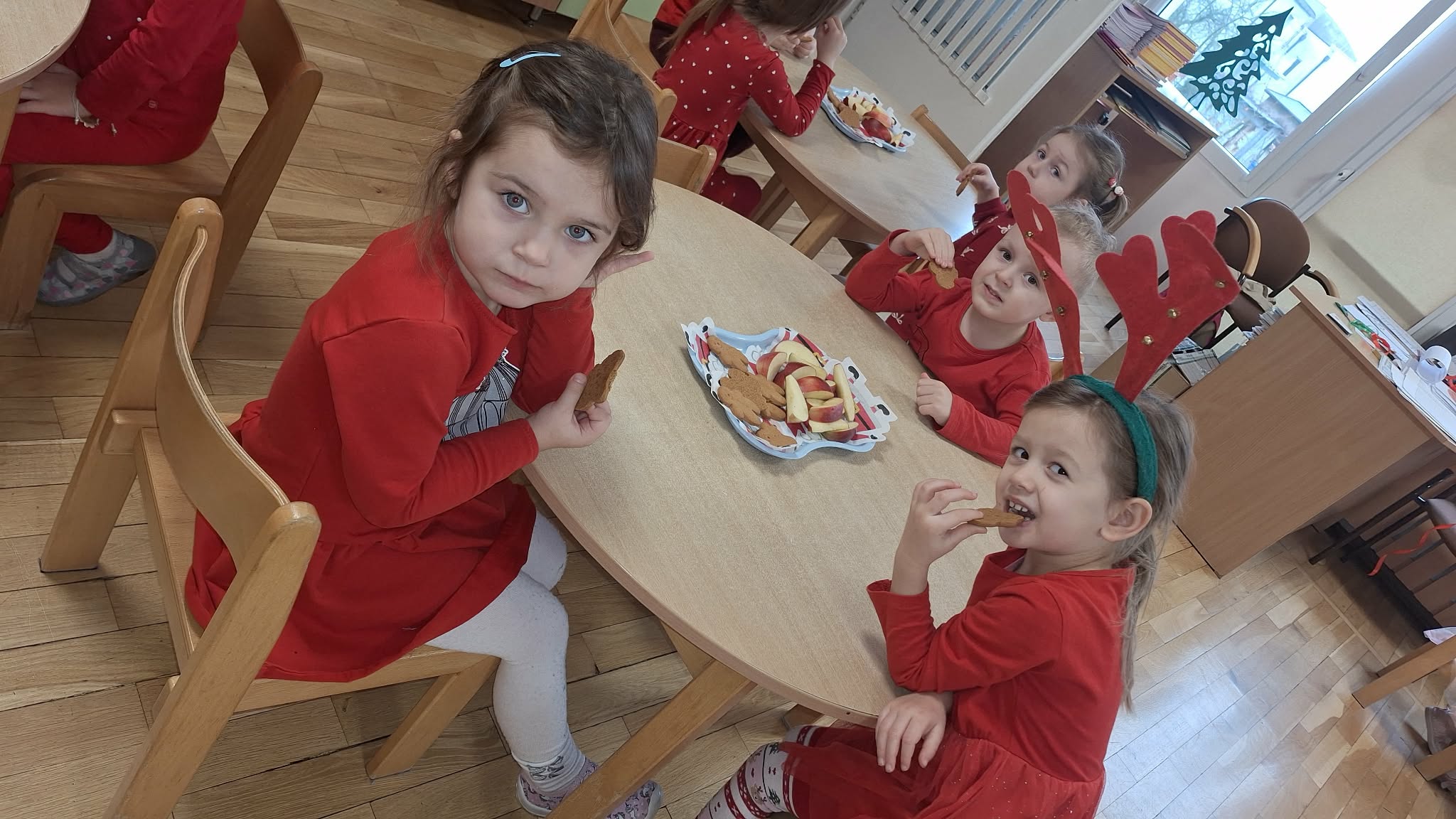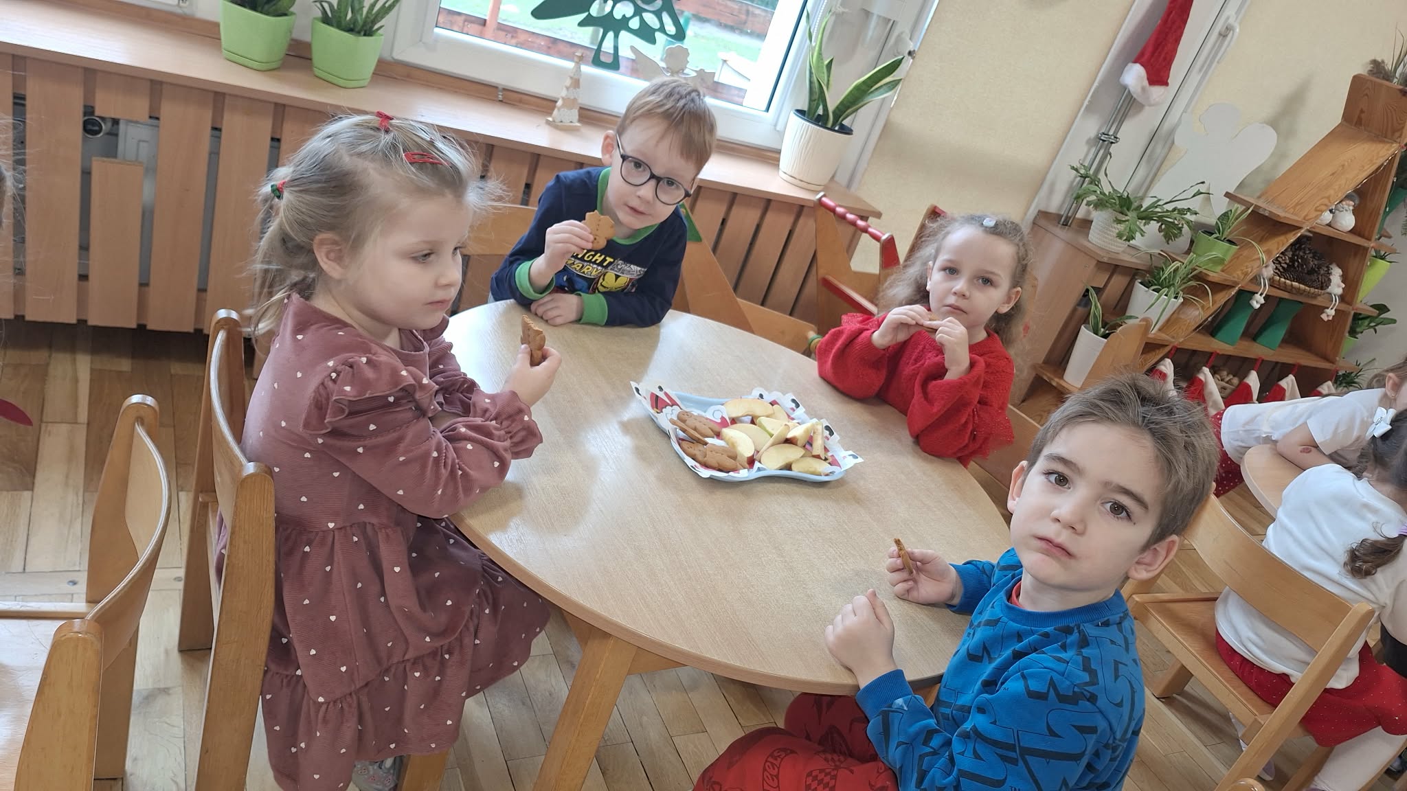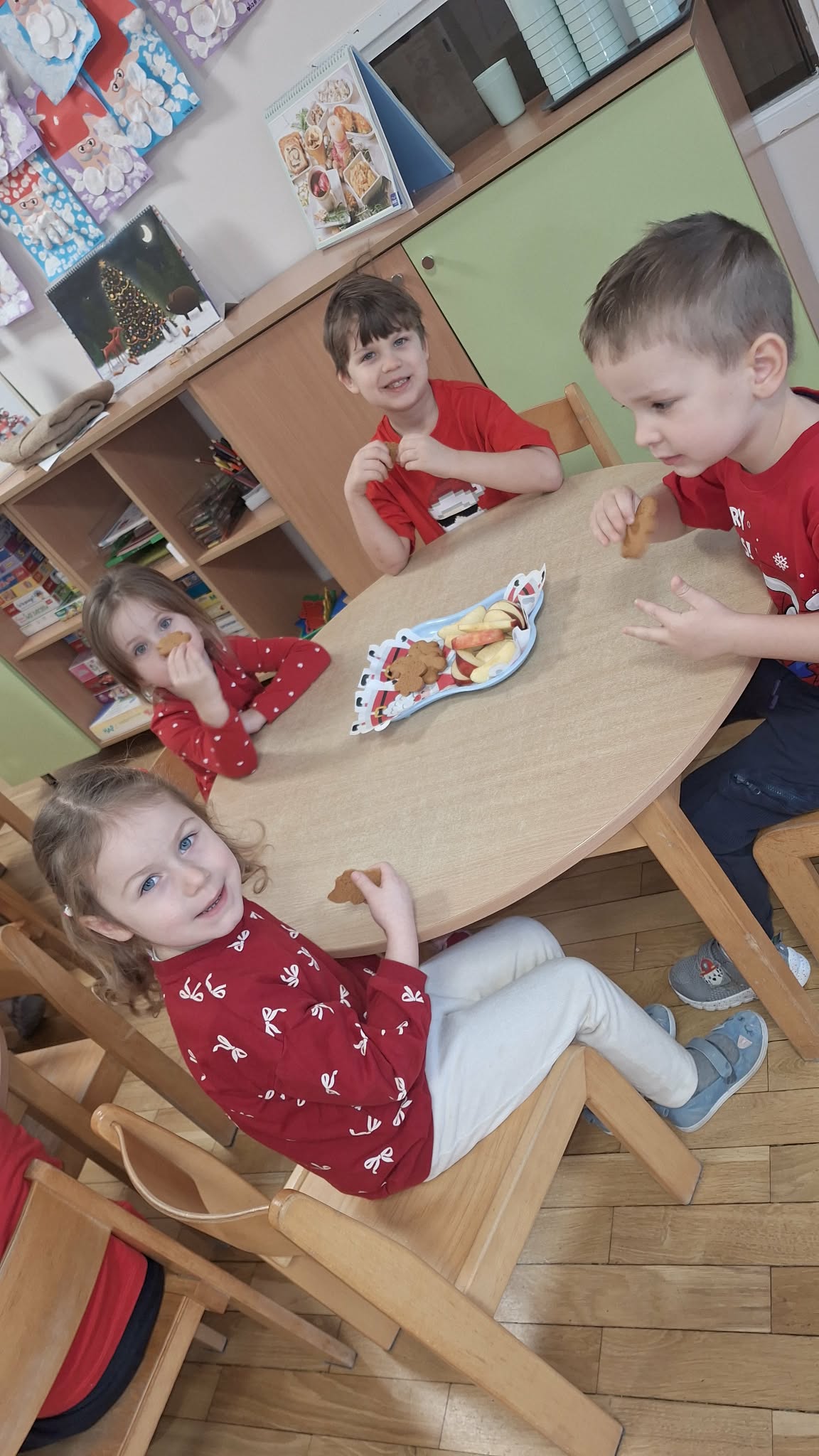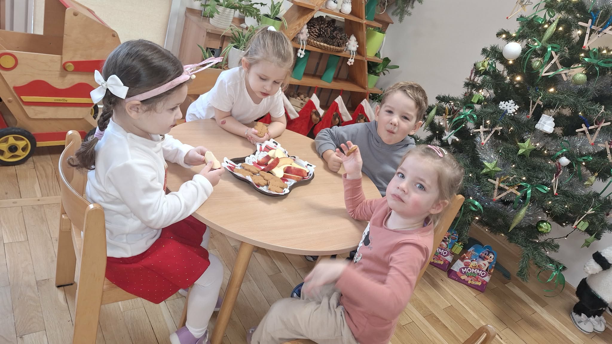 Mikołajki to dzień, na który dzieci czekają z niecierpliwością. W tym dniu nasze przedszkolaki zamieniły się w pomocników Mikołaja i przyszły do przedszkola w czerwonych strojach oraz czapeczkach. Na przedszkolaków tego dnia pod choinką czekały słodkie upominki, które podrzucił sam Święty Mikołaj – pozostawiając ślady butów na podłodze i okruszki po zjedzonym ciasteczku i pustej szklanki po wypitym mleku. Przedszkolaki tego dnia śpiewały piosenkę o Mikołaju, brały udział w zabawach ruchowych, wykonały prace plastyczne ćwicząc przy tym cięcie nożyczkami. Dzieci segregowały papierowe prezenty, nazywały ilustracje z nazwami zabawek. Wieszały pranie Mikołaja. Na koniec zjadły słodką przekąskę w postaci jabłka oraz pierniczków, które zostawił dla nich Święty Mikołaj. To był wspaniały, pełen radości dzień.