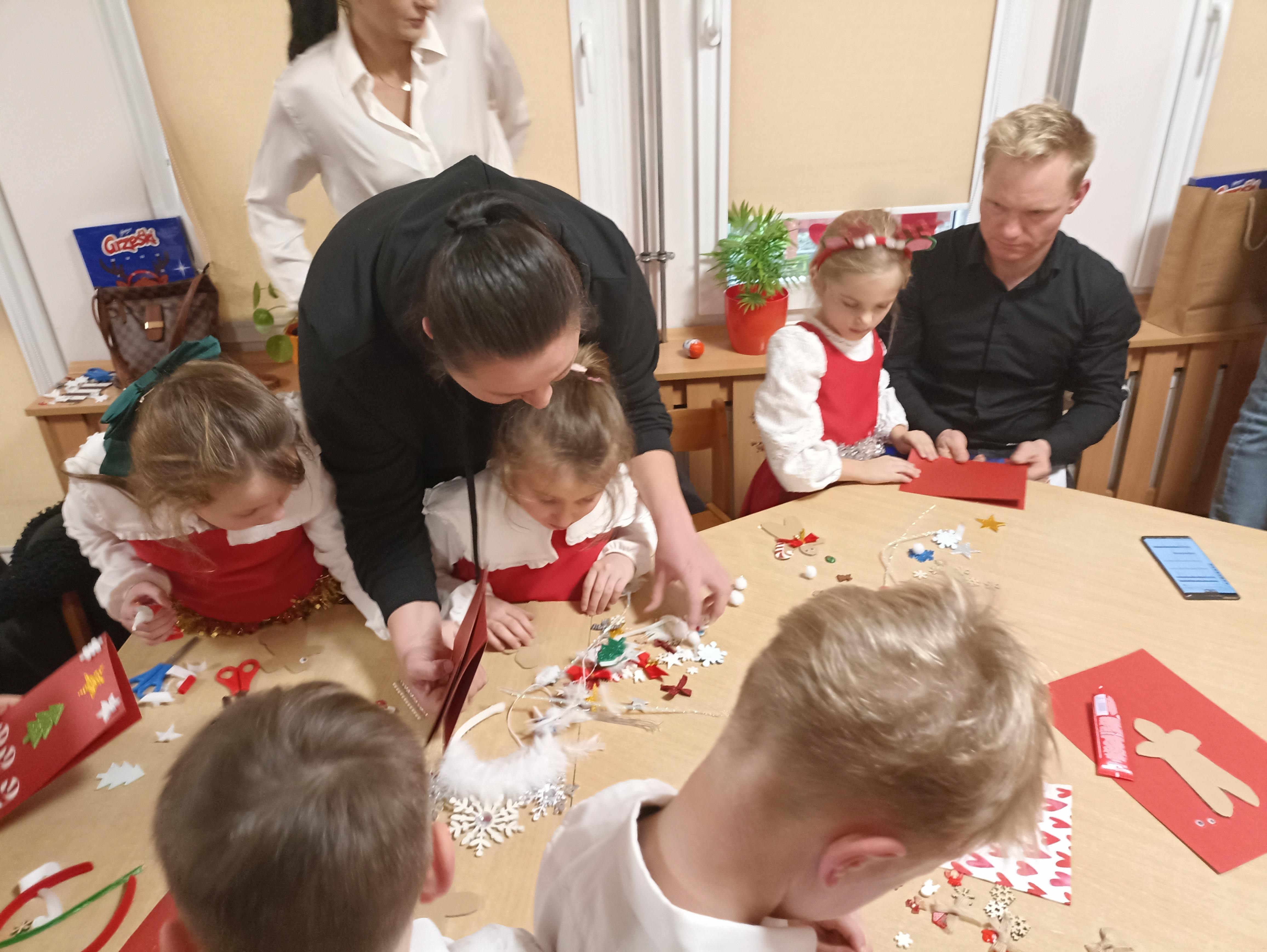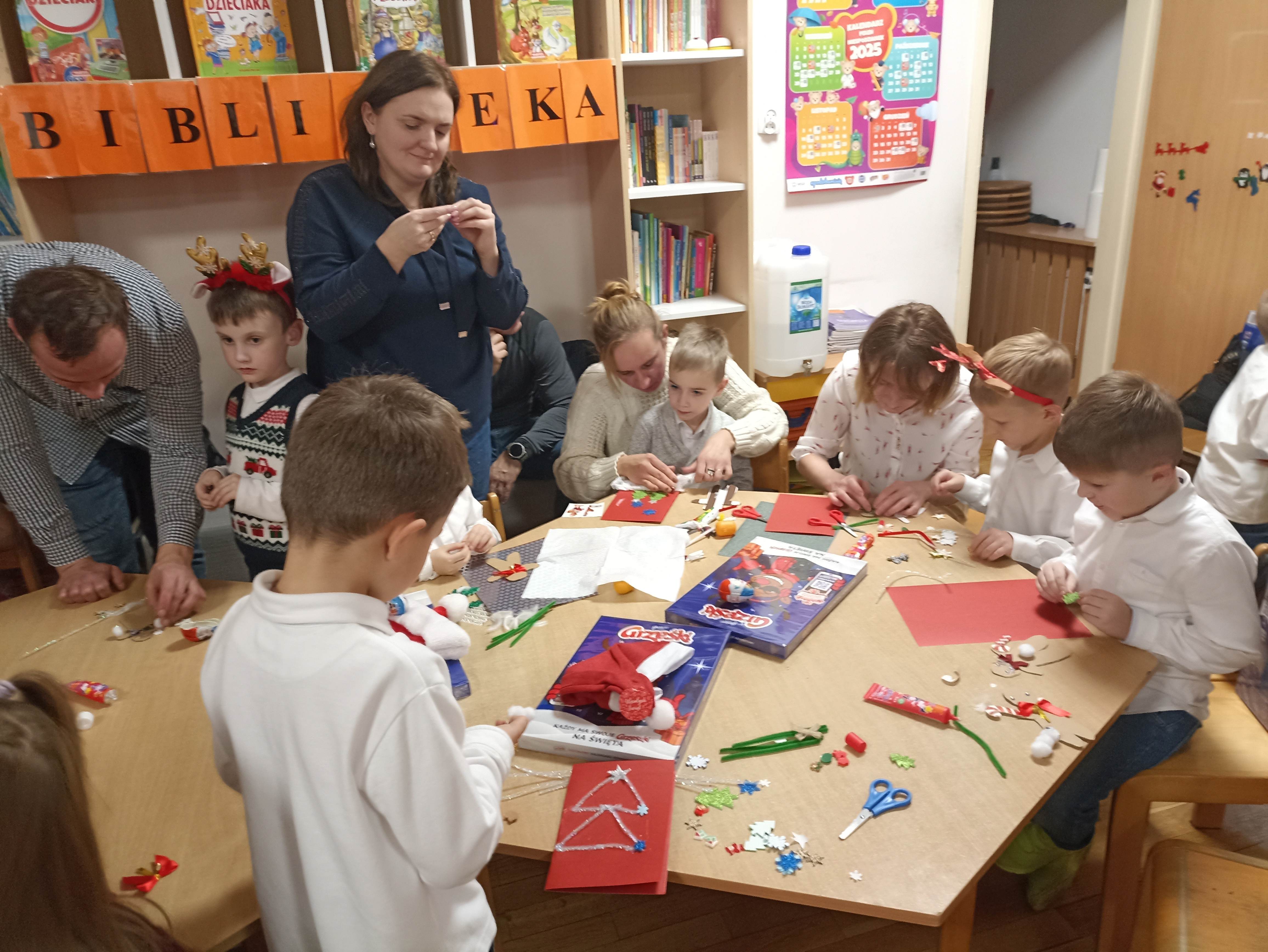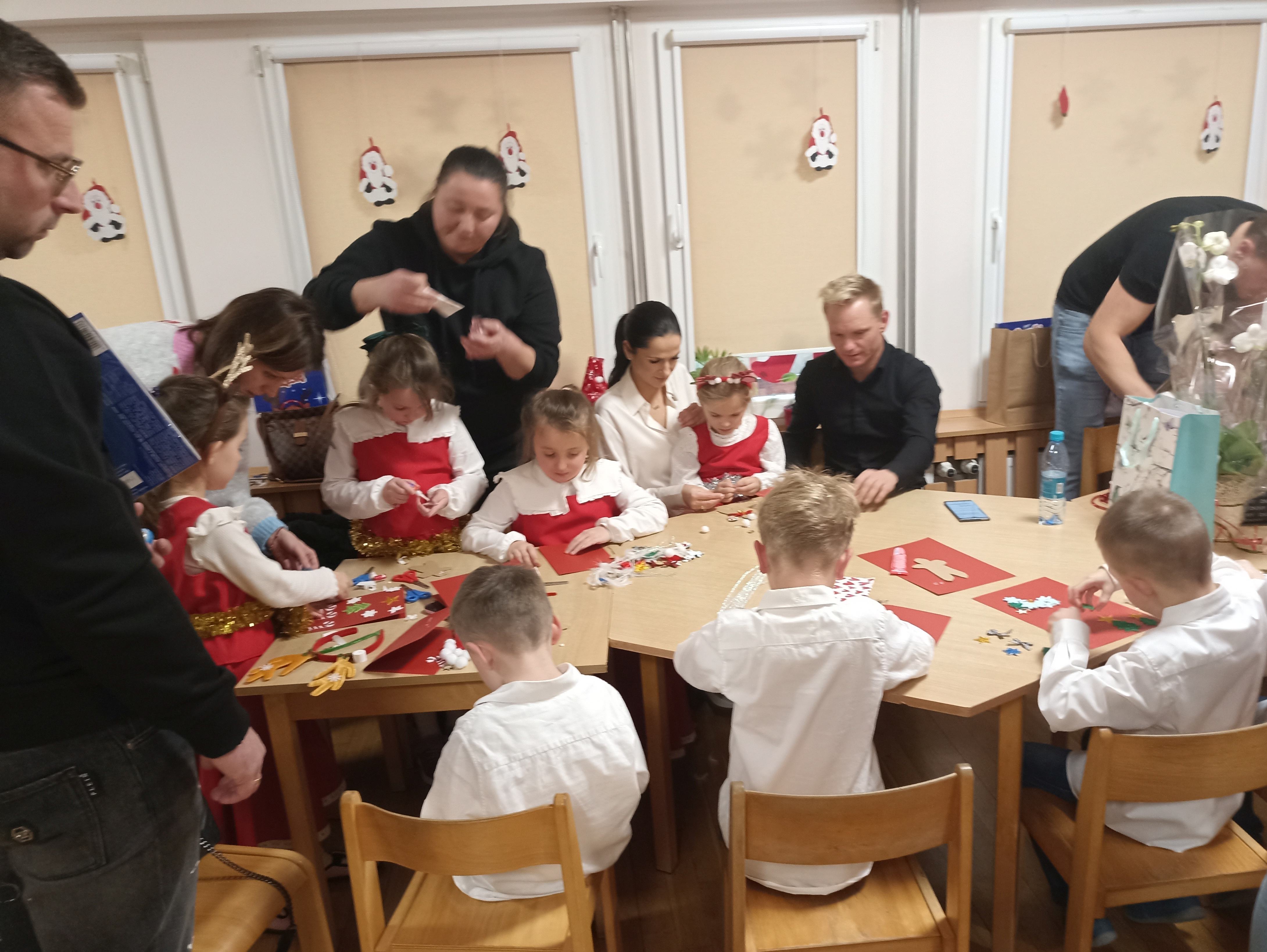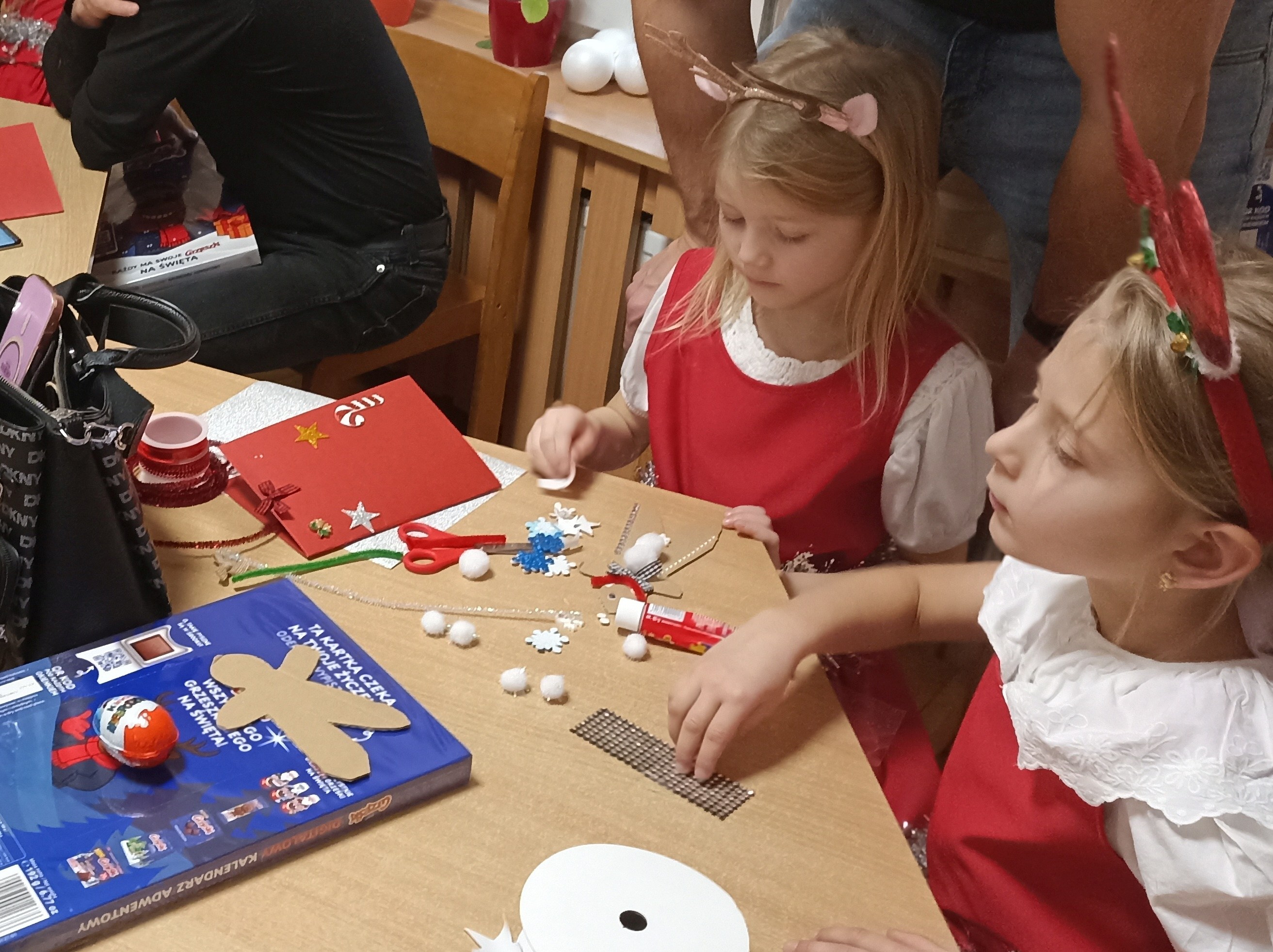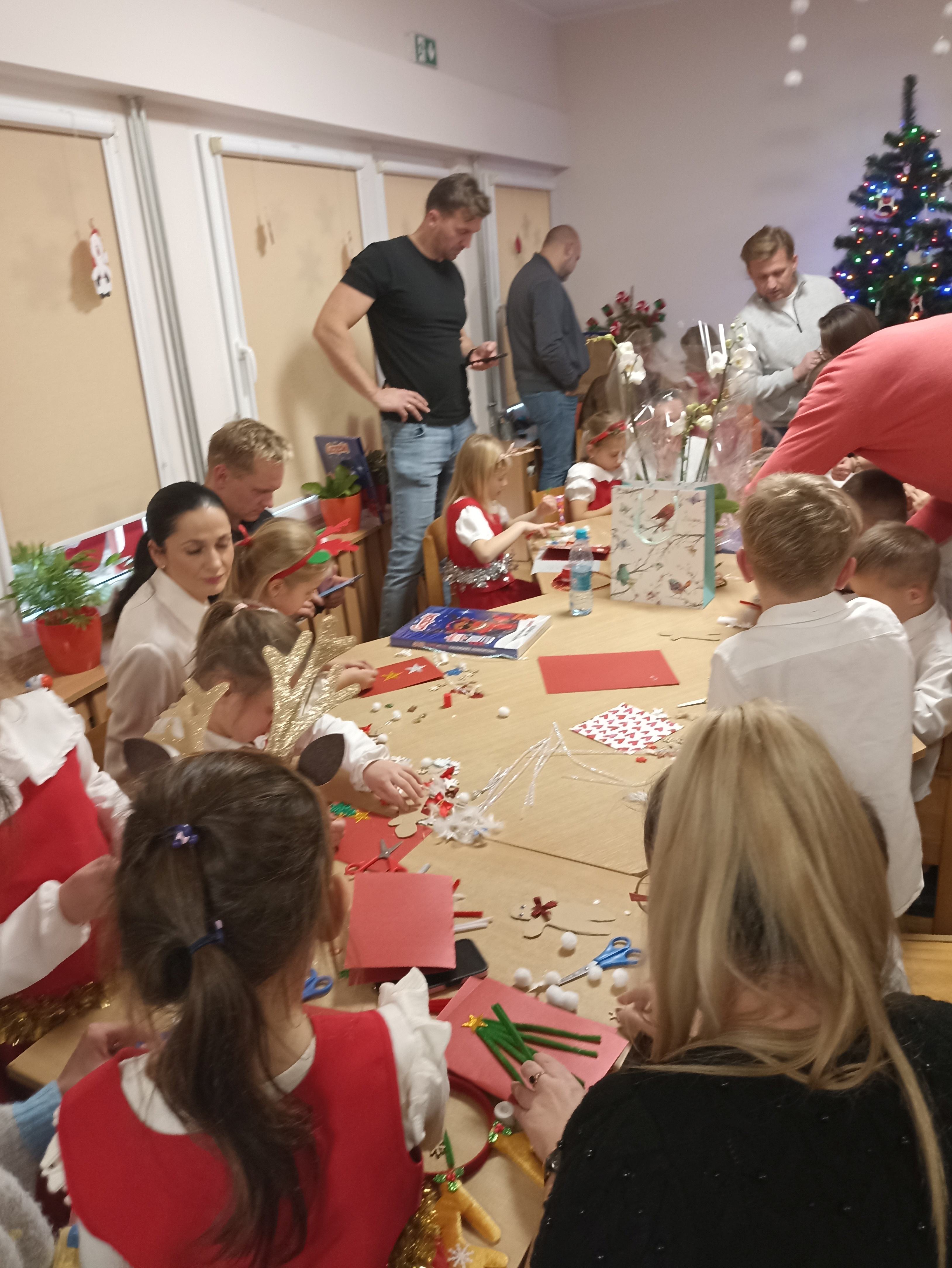 Po części artystycznej przyszedł czas na twórczą zabawę. Dzieci wraz z najbliższymi wykonywali bożonarodzeniowe kartki oraz ozdoby na choinkę, korzystając z różnorodnych materiałów plastycznych. Wspólne tworzenie dostarczyło wszystkim wiele radości, a efekty pracy wprowadziły prawdziwie świąteczną atmosferę.