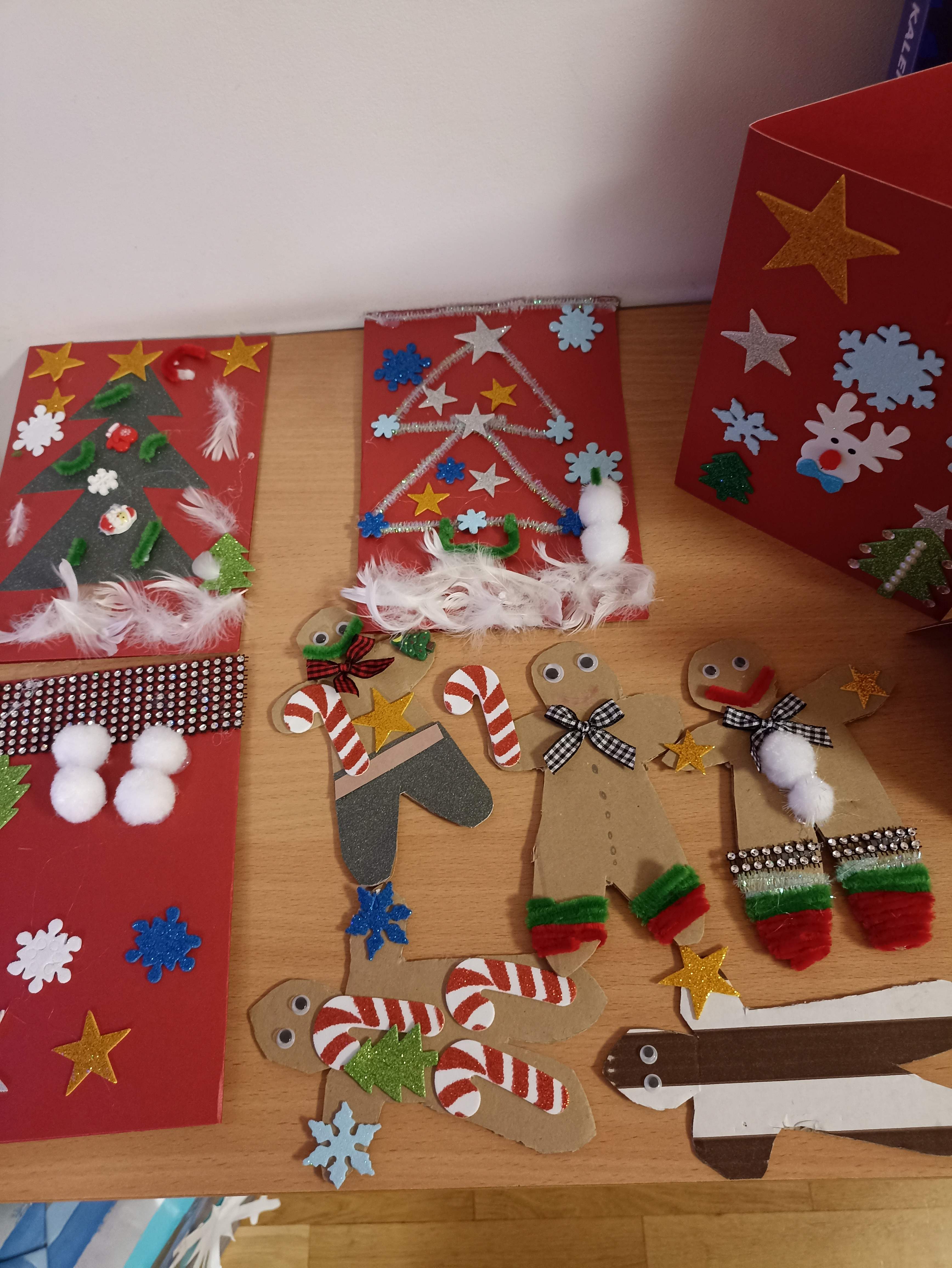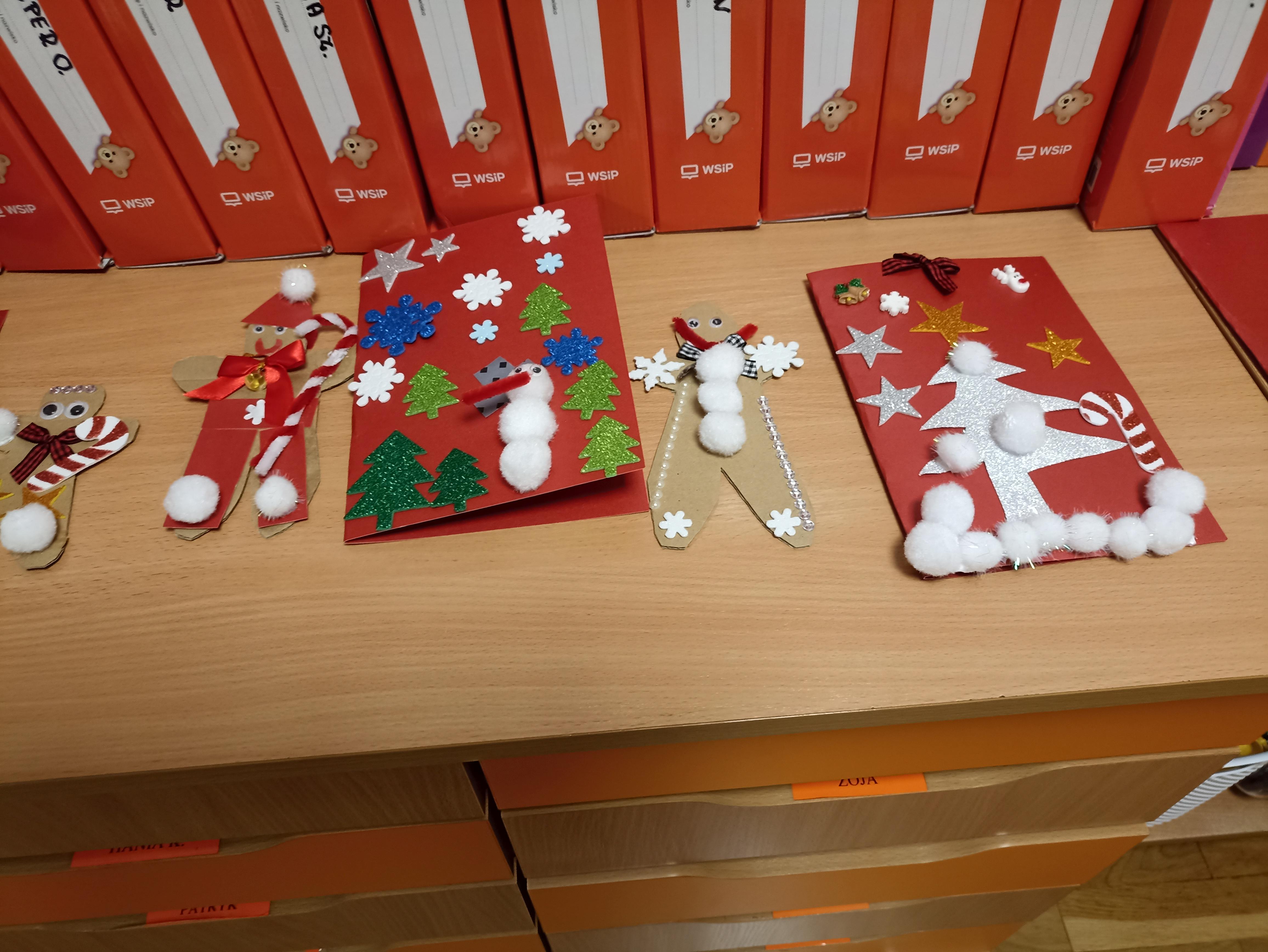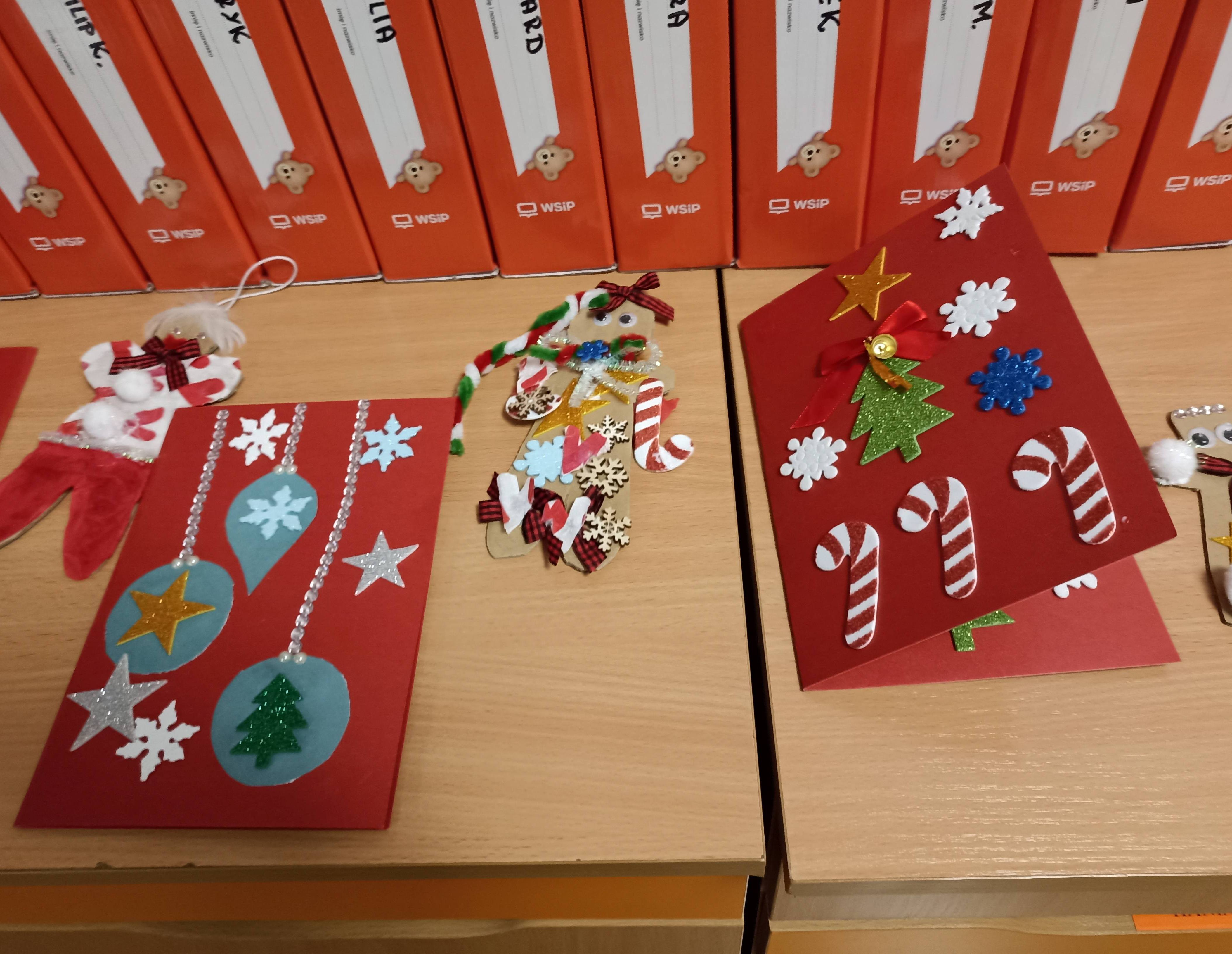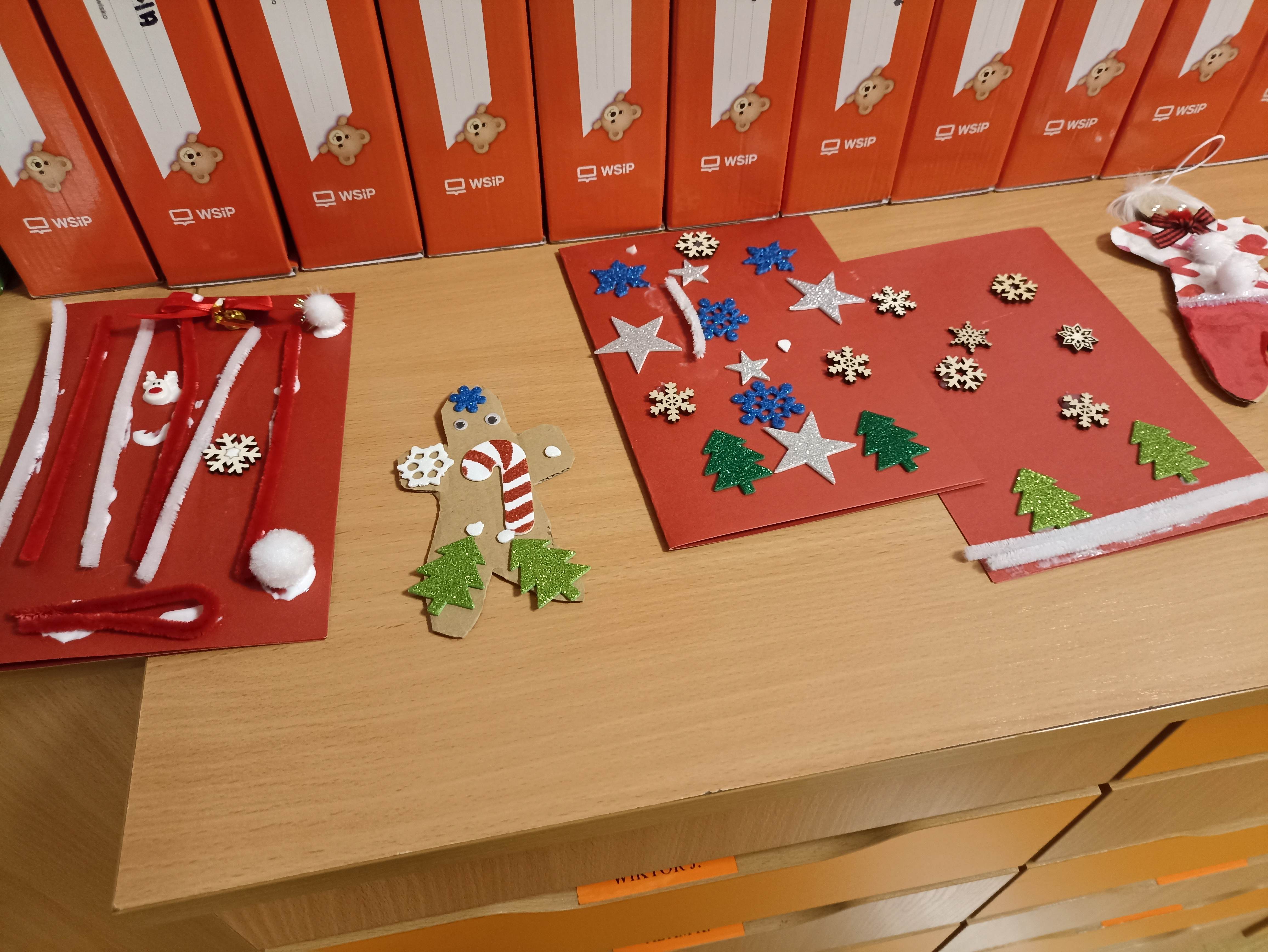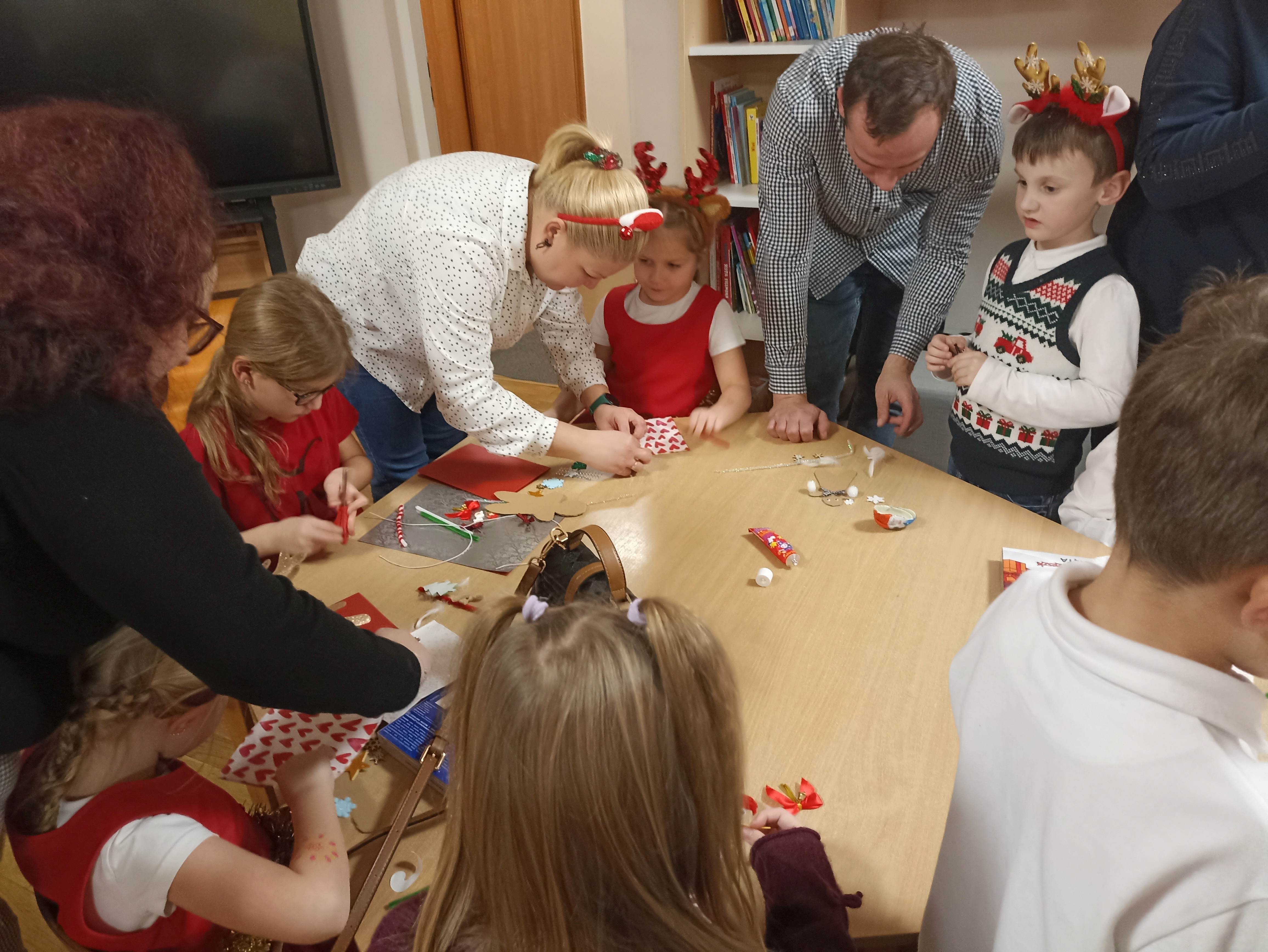Po części artystycznej przyszedł czas na twórczą zabawę. Dzieci wraz z najbliższymi wykonywali bożonarodzeniowe kartki oraz ozdoby na choinkę, korzystając z różnorodnych materiałów plastycznych. Wspólne tworzenie dostarczyło wszystkim wiele radości, a efekty pracy wprowadziły prawdziwie świąteczną atmosferę.