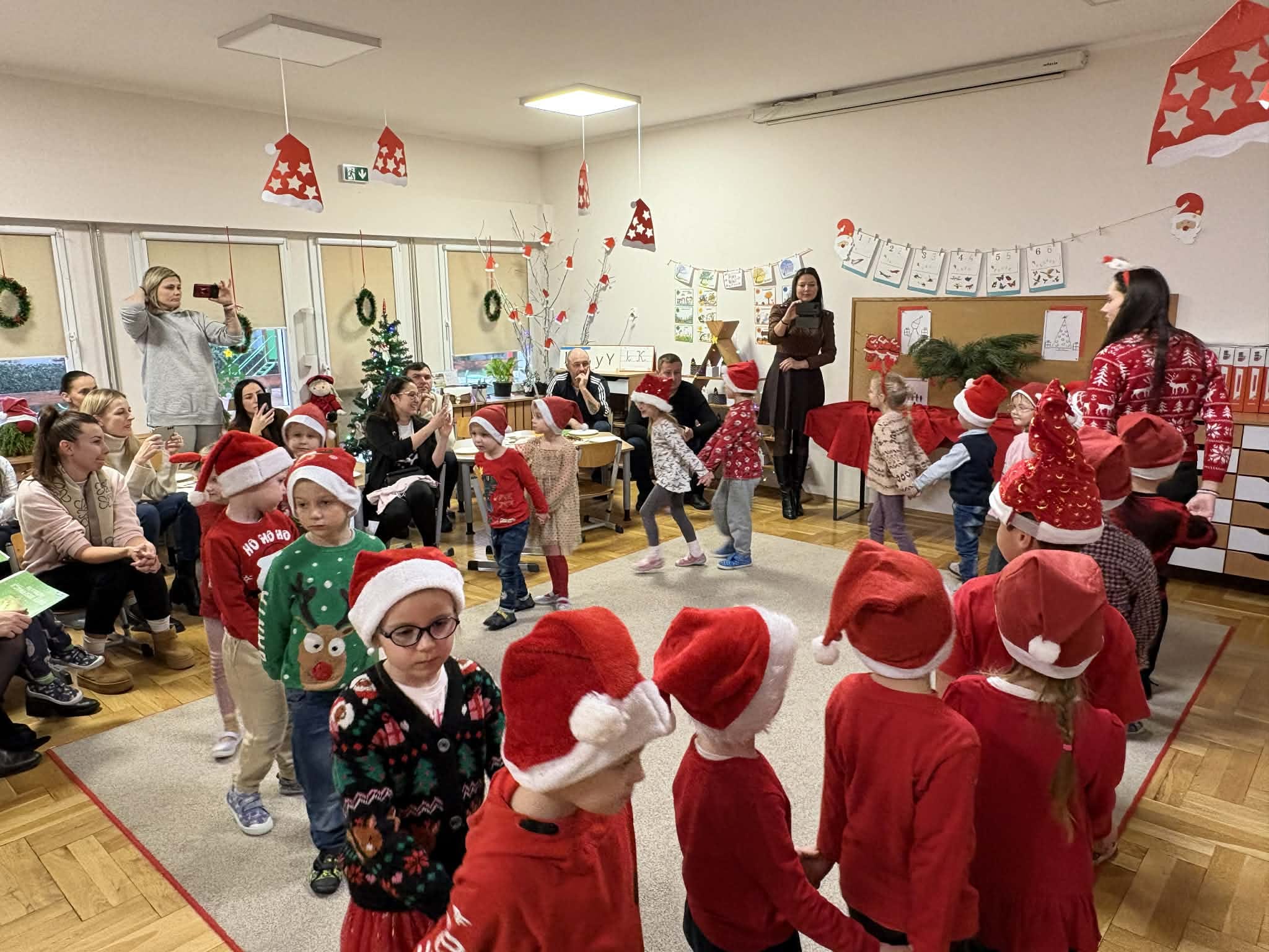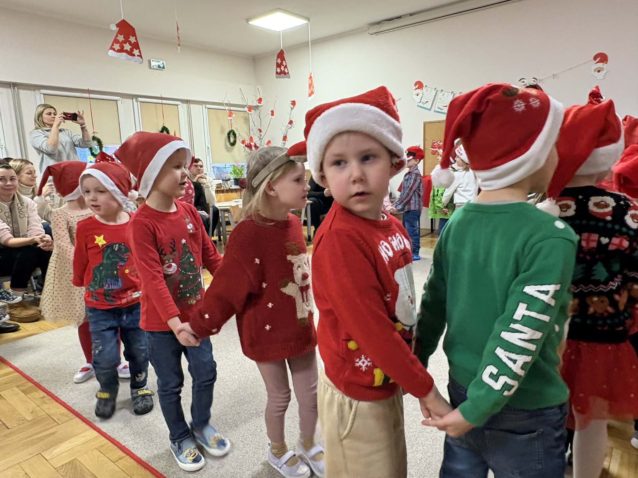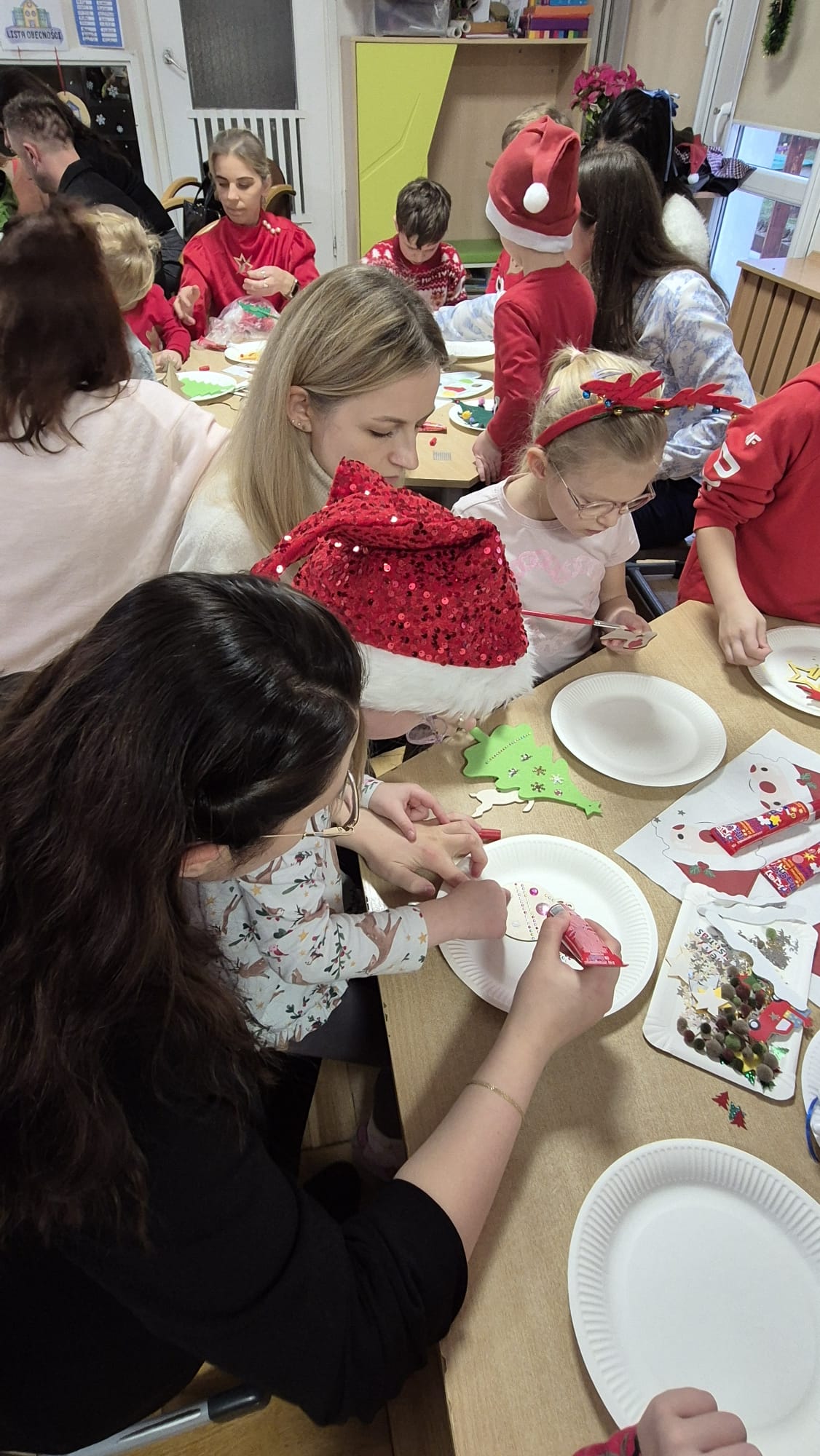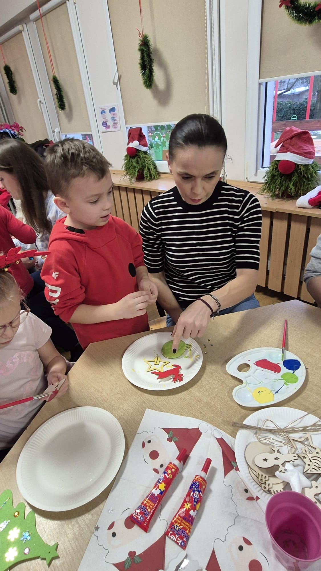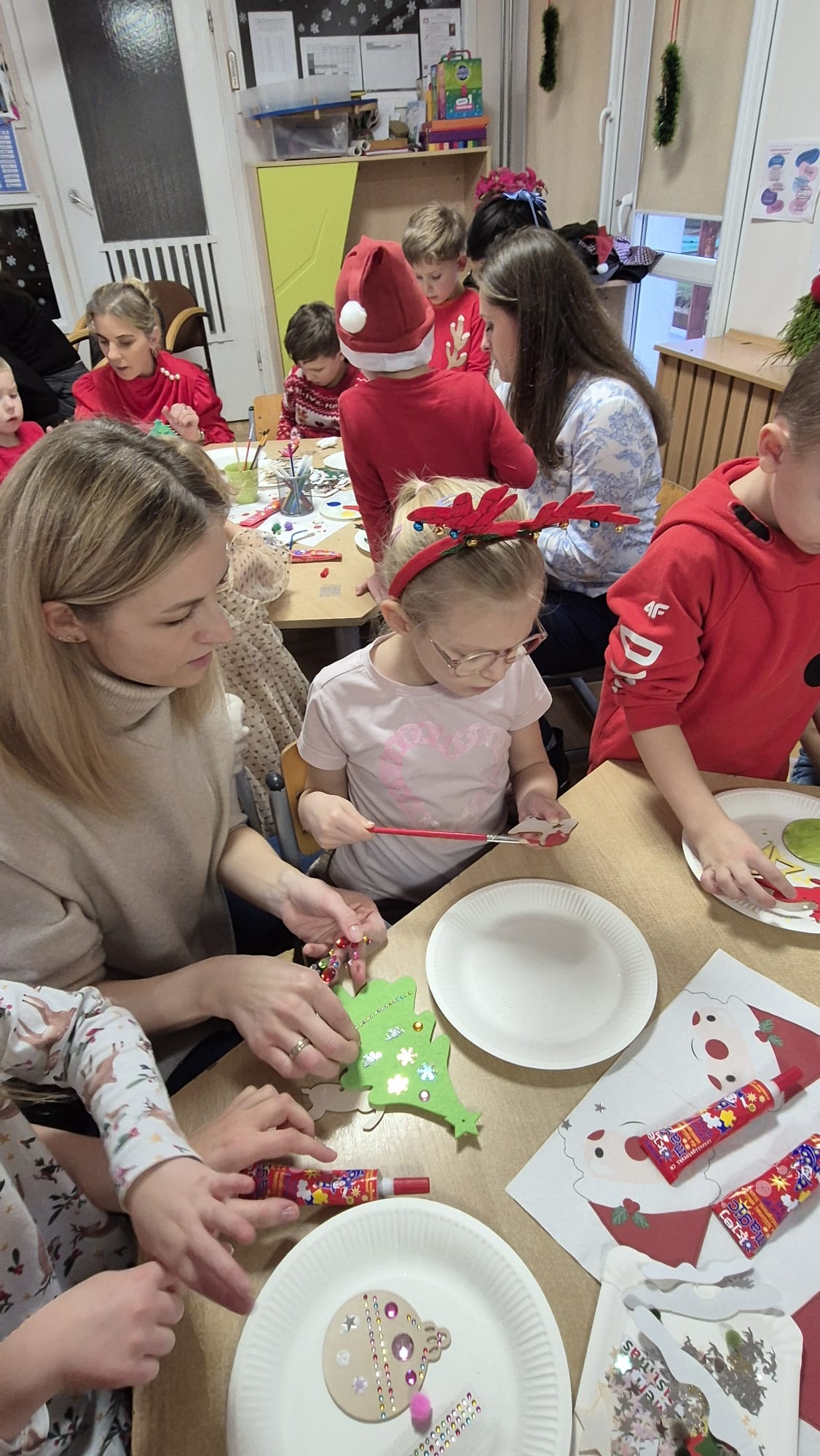 Na początku dzieci śpiewem i tańcem wprowadziły gości w odpowiedni Mikołajowy nastrój. Następnie wszyscy przystąpili do wykonania ozdób na choinkę.