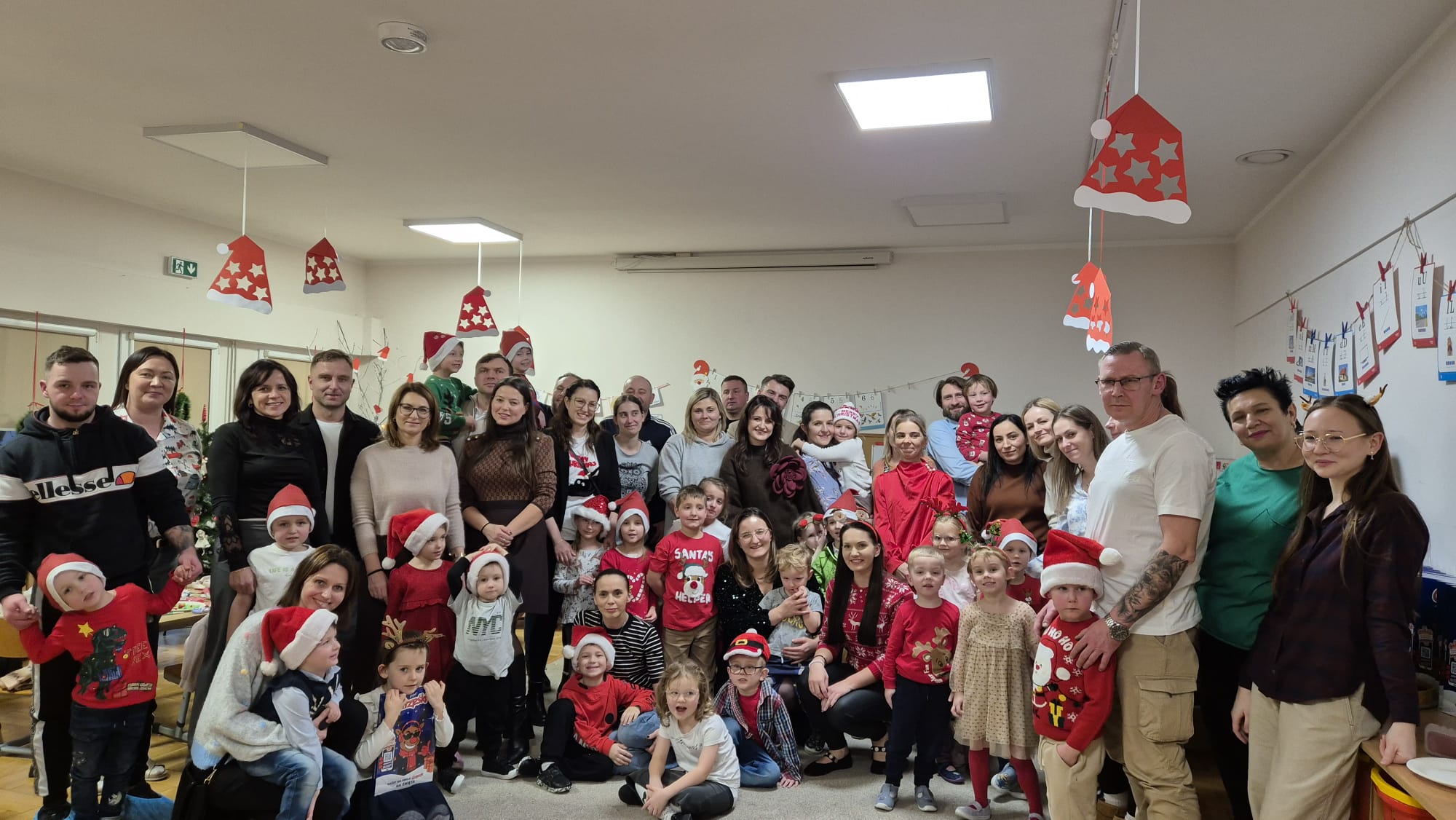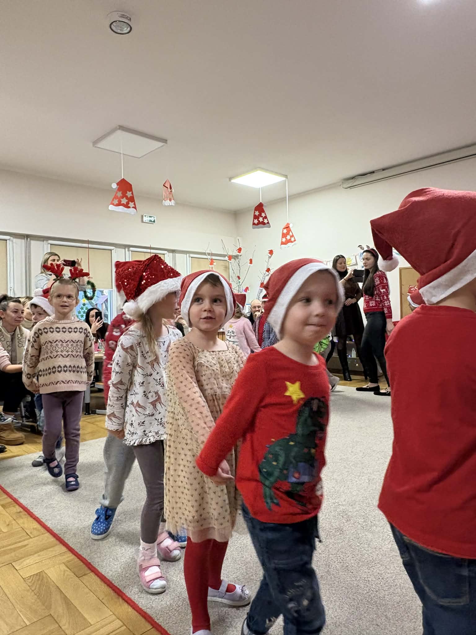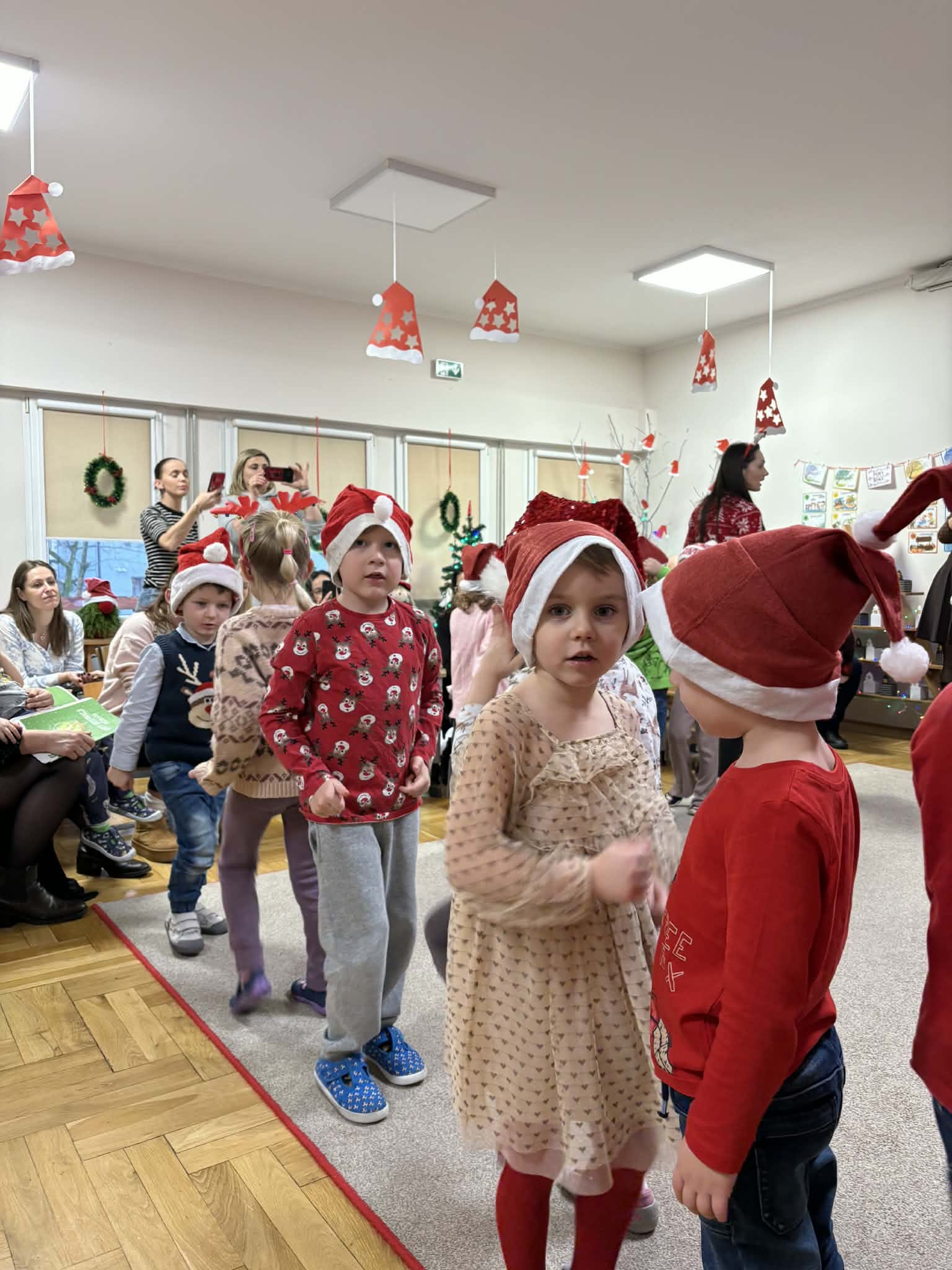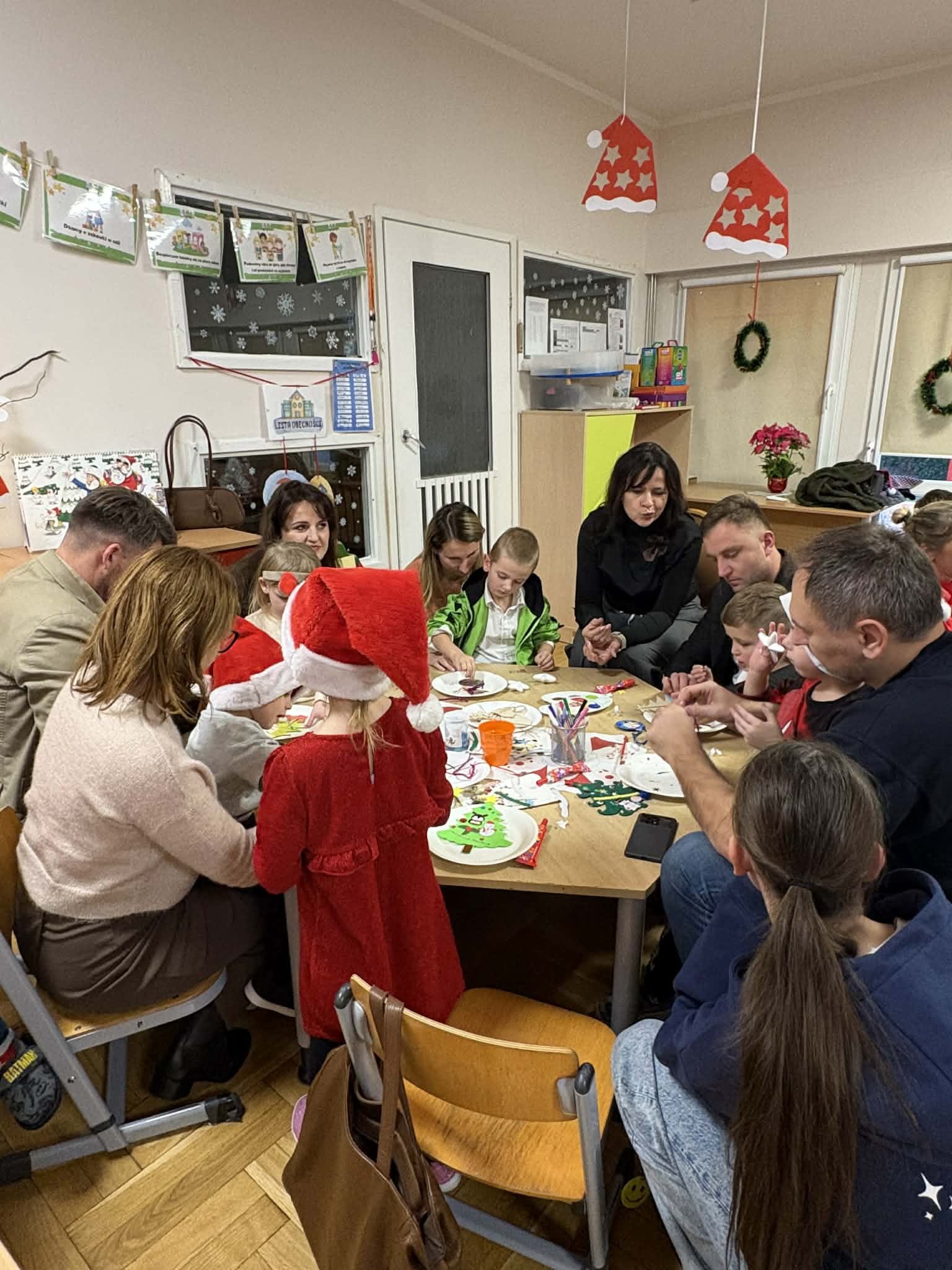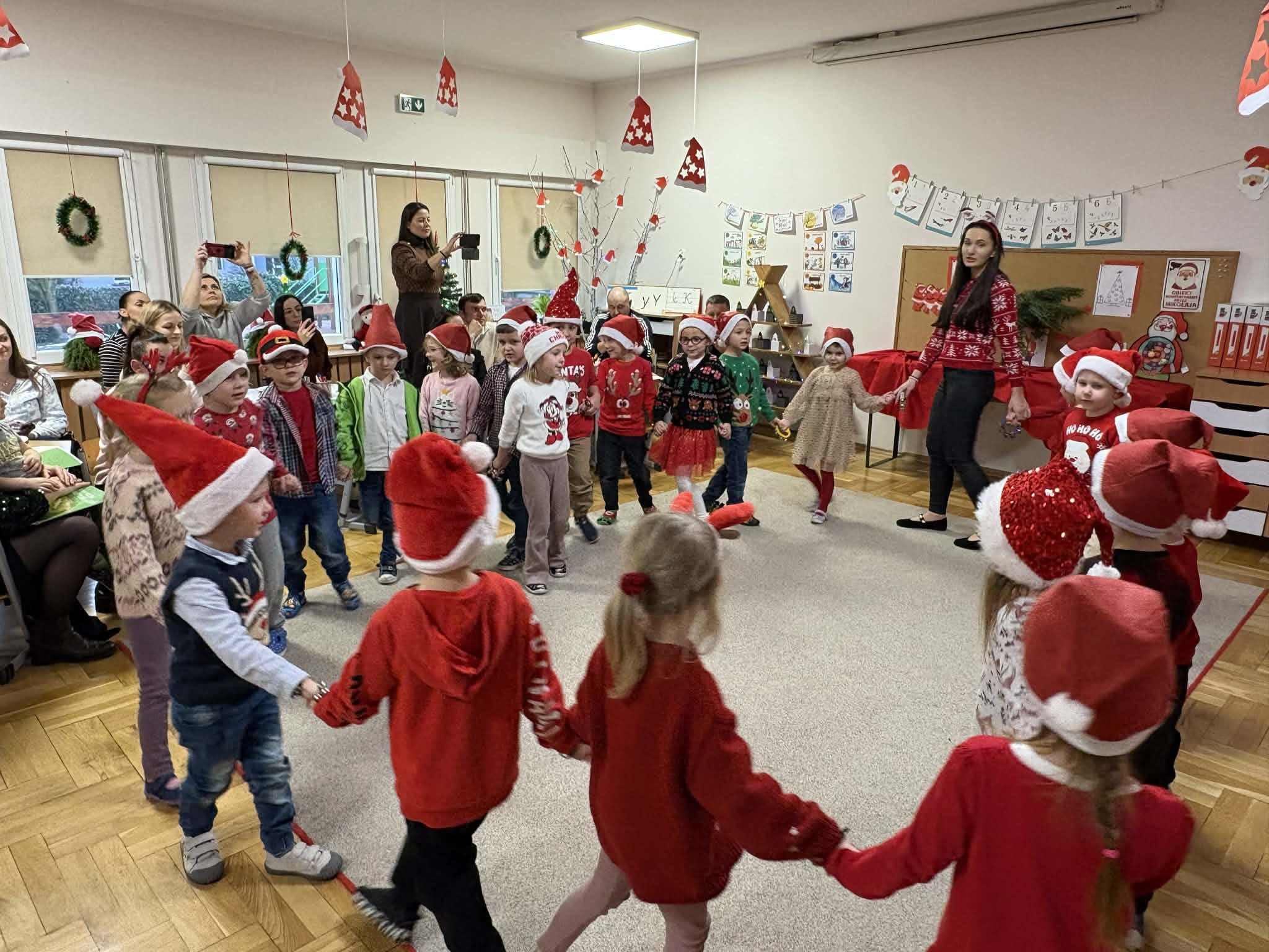 Na początku dzieci śpiewem i tańcem wprowadziły gości w odpowiedni Mikołajowy nastrój. Następnie wszyscy przystąpili do wykonania ozdób na choinkę.