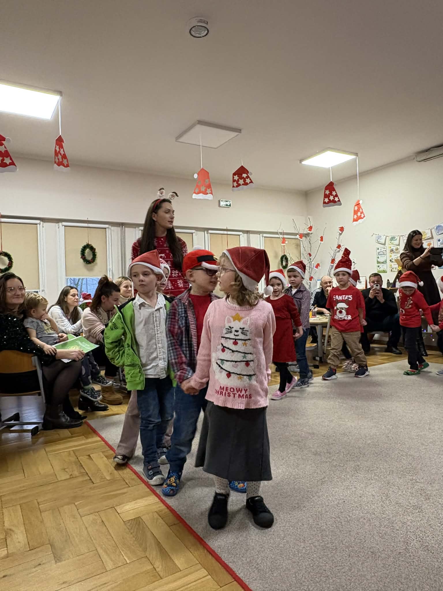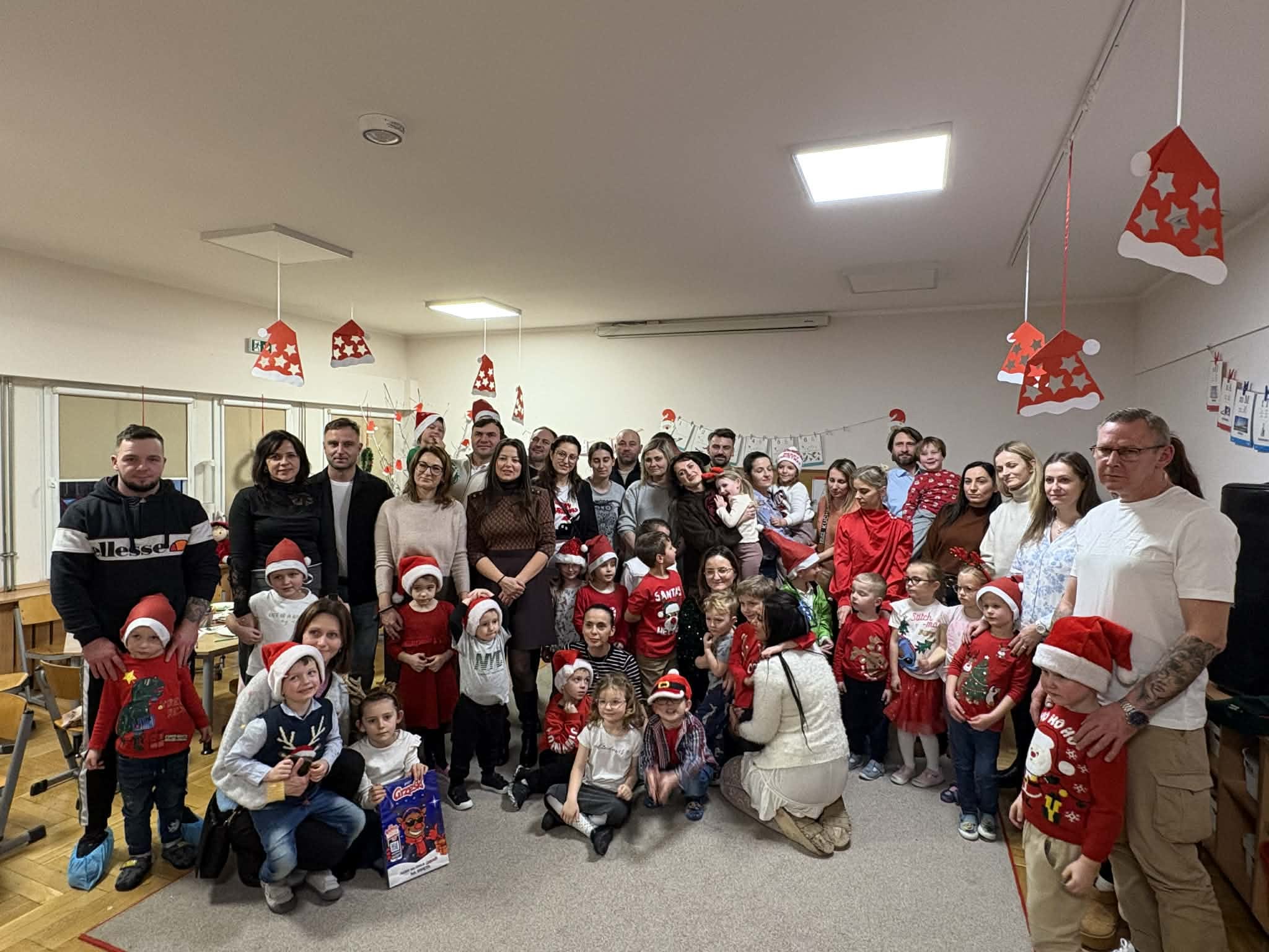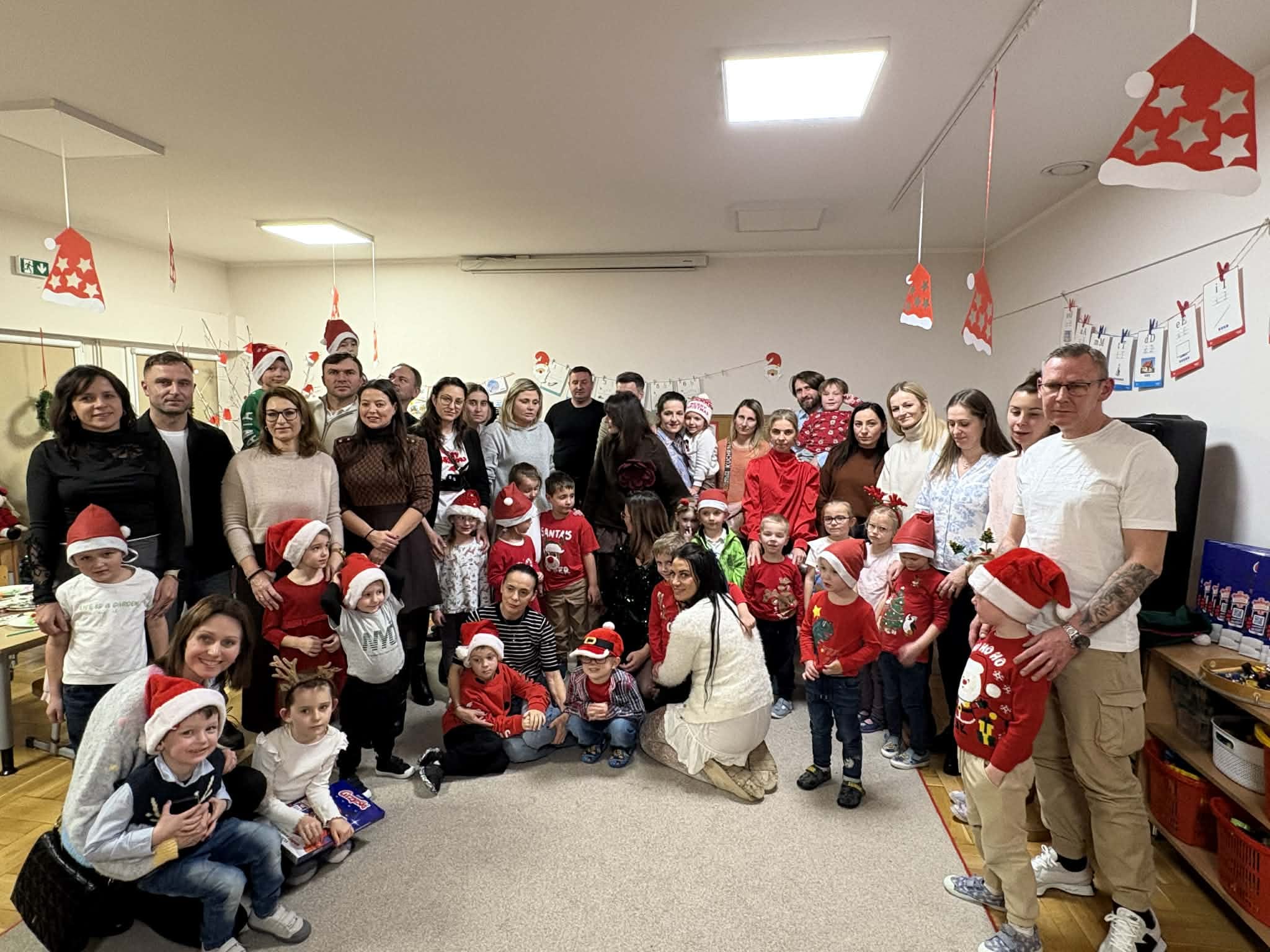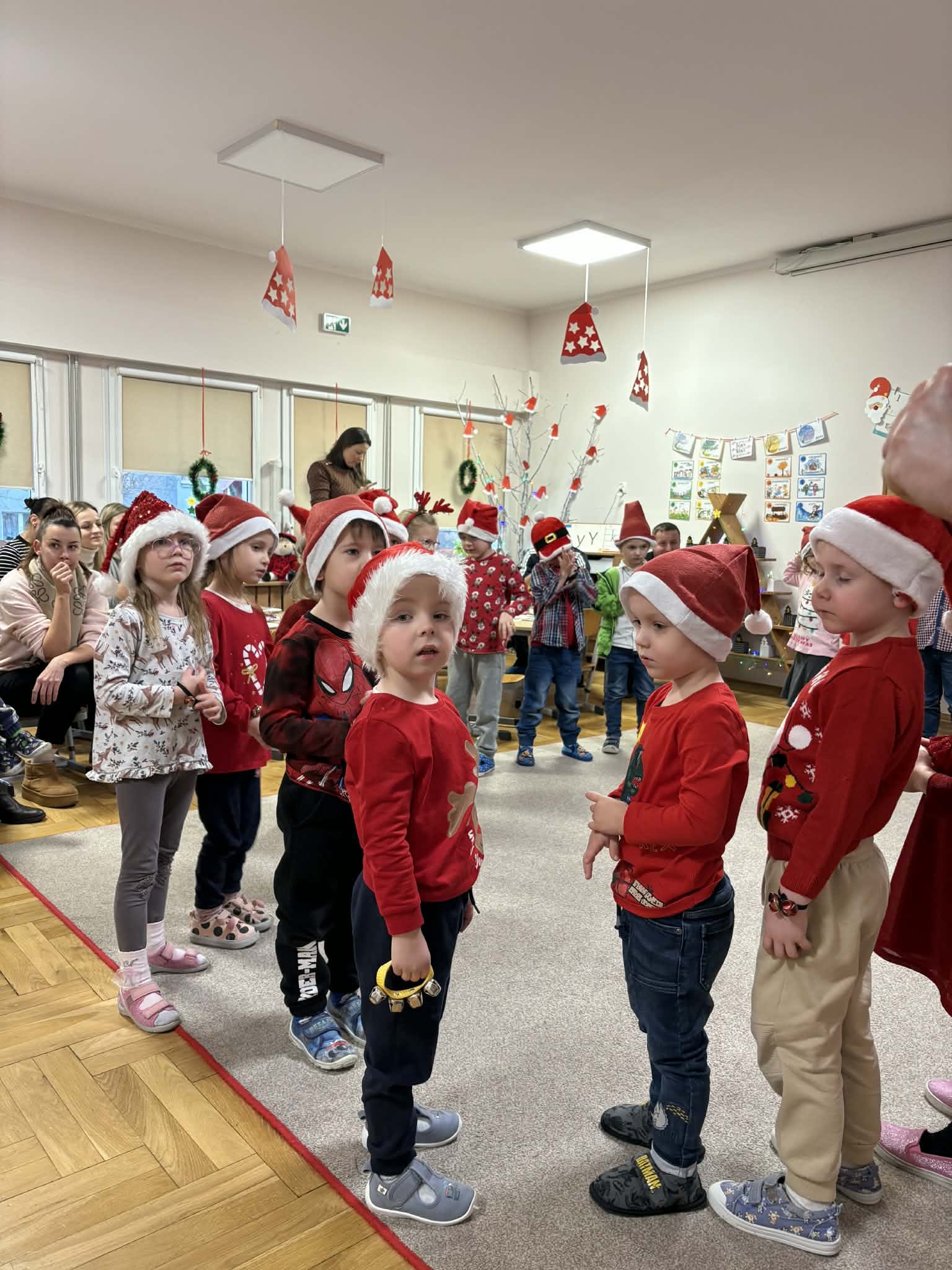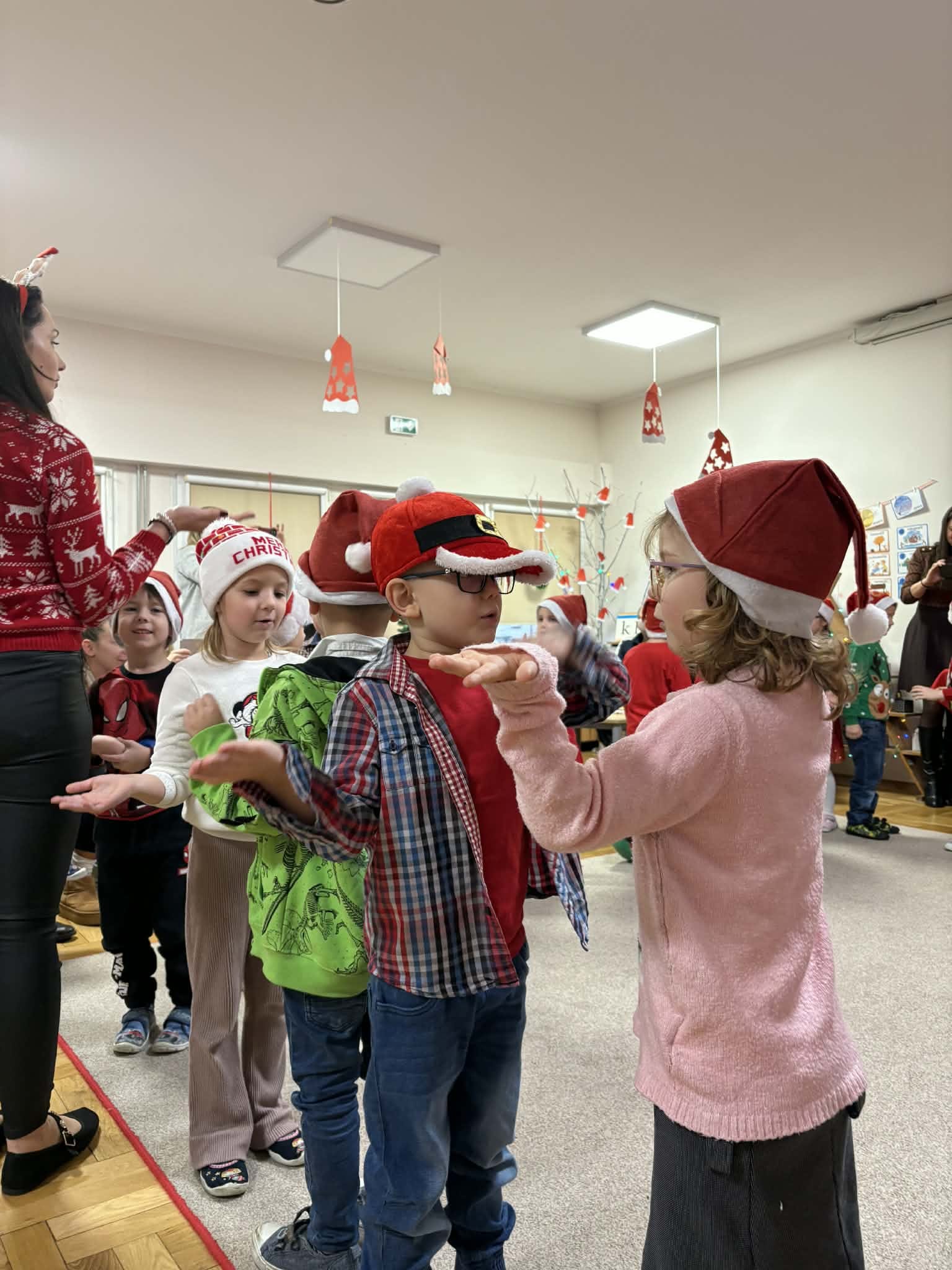 Na początku dzieci śpiewem i tańcem wprowadziły gości w odpowiedni Mikołajowy nastrój. Następnie wszyscy przystąpili do wykonania ozdób na choinkę.