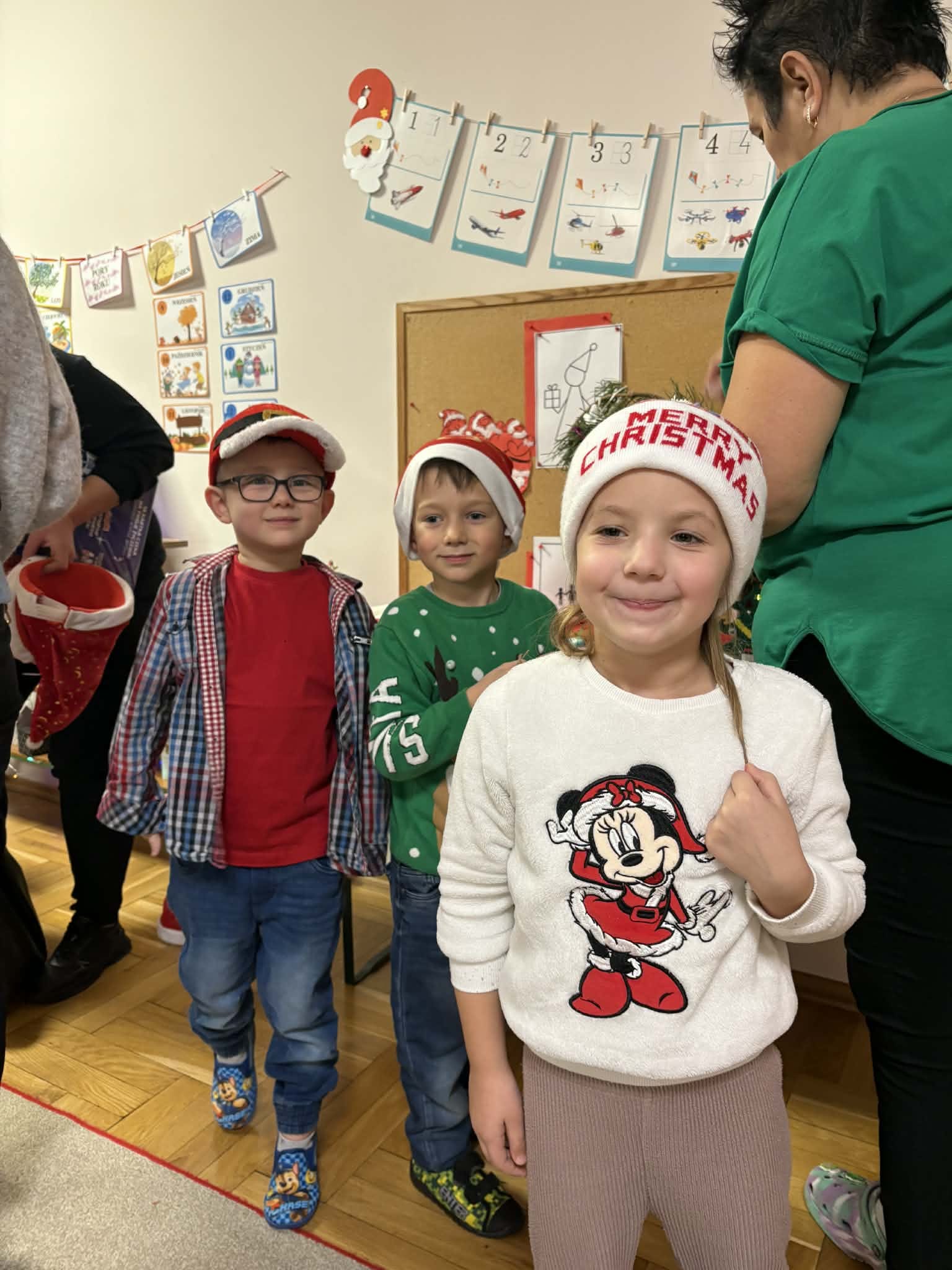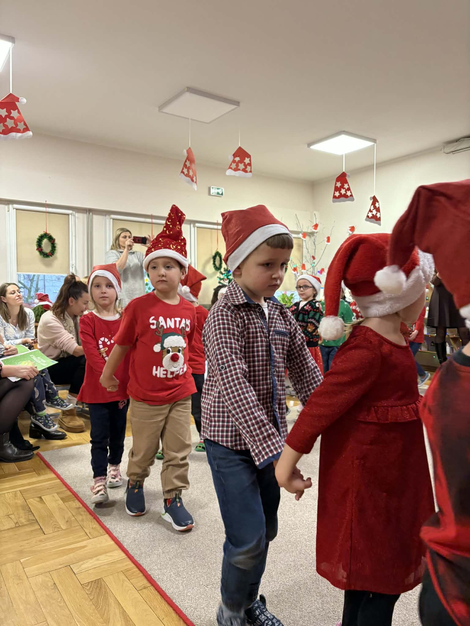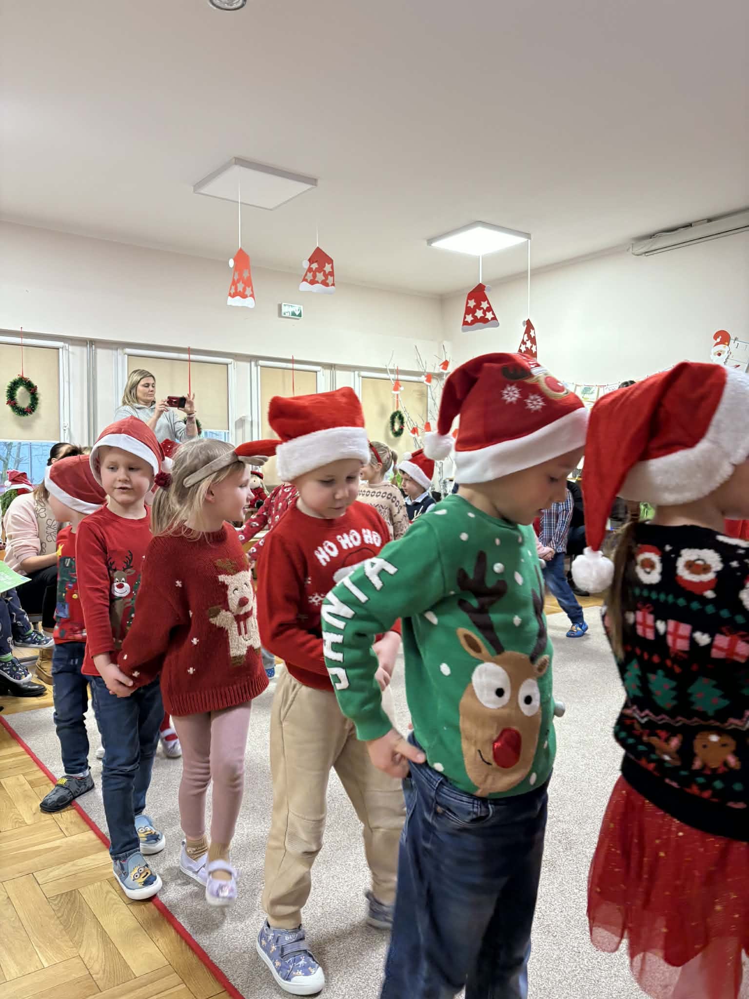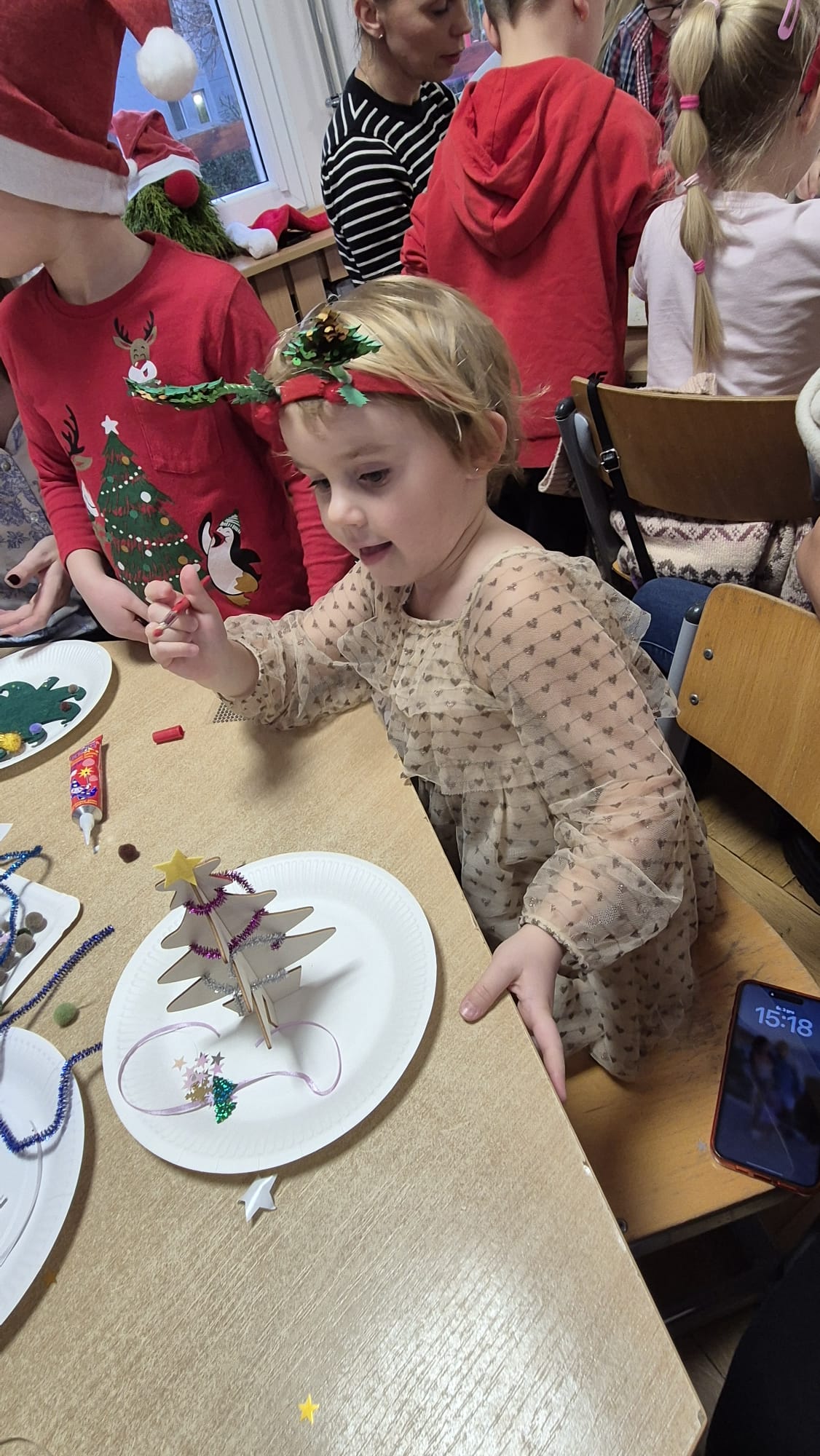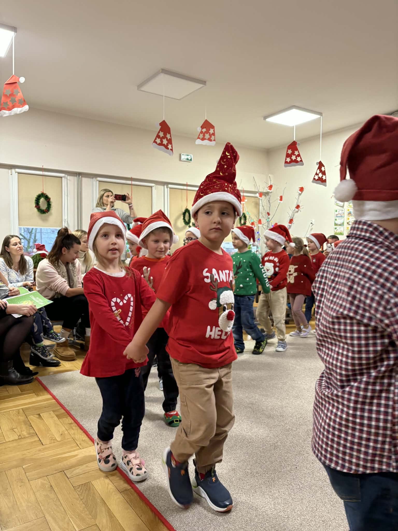 Na początku dzieci śpiewem i tańcem wprowadziły gości w odpowiedni Mikołajowy nastrój. Następnie wszyscy przystąpili do wykonania ozdób na choinkę.