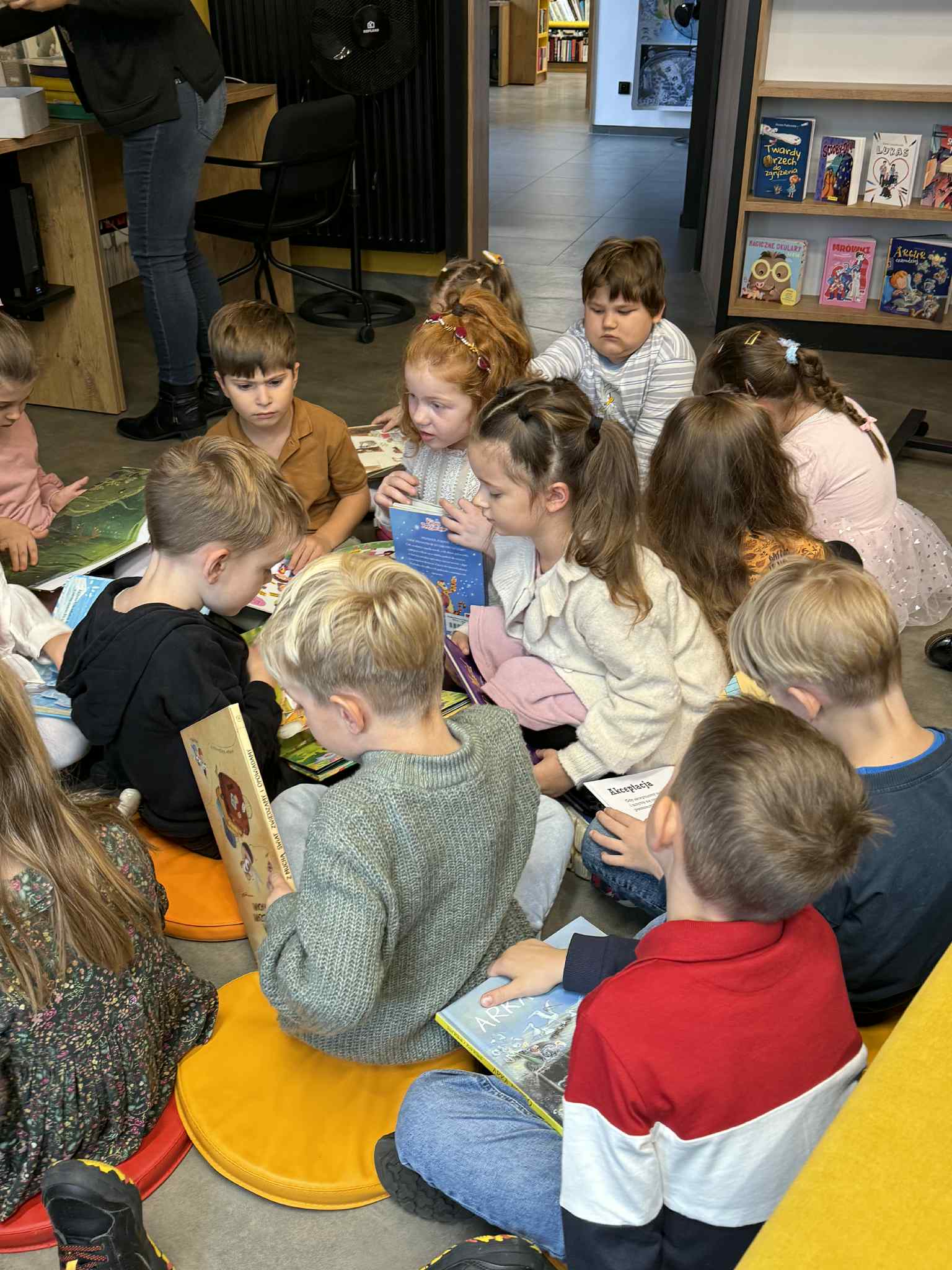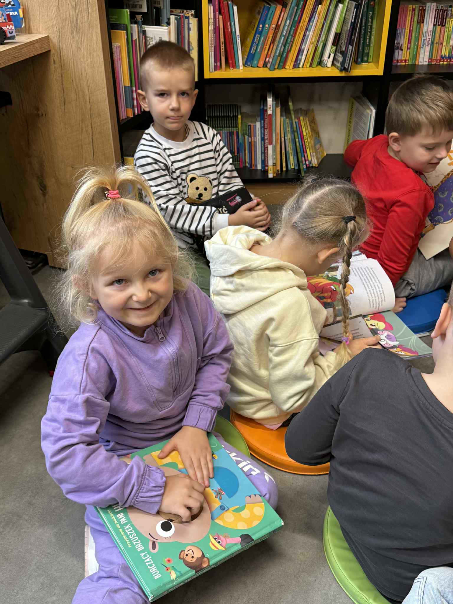 Przedszkolaki z wielką radością zapoznały się z magicznym dla nich miejscem. Była to pierwsza wizyta wśród tylu książek. Z tematem spotkania zapoznała z biblioteką Pani Zuzia, opowiadała dzieciom o tym magicznym miejscu, z wielkim zainteresowaniem dzieci oglądały książki znajdujące się na półkach, ale szczególnie zainteresował ich dział dla najmłodszych.