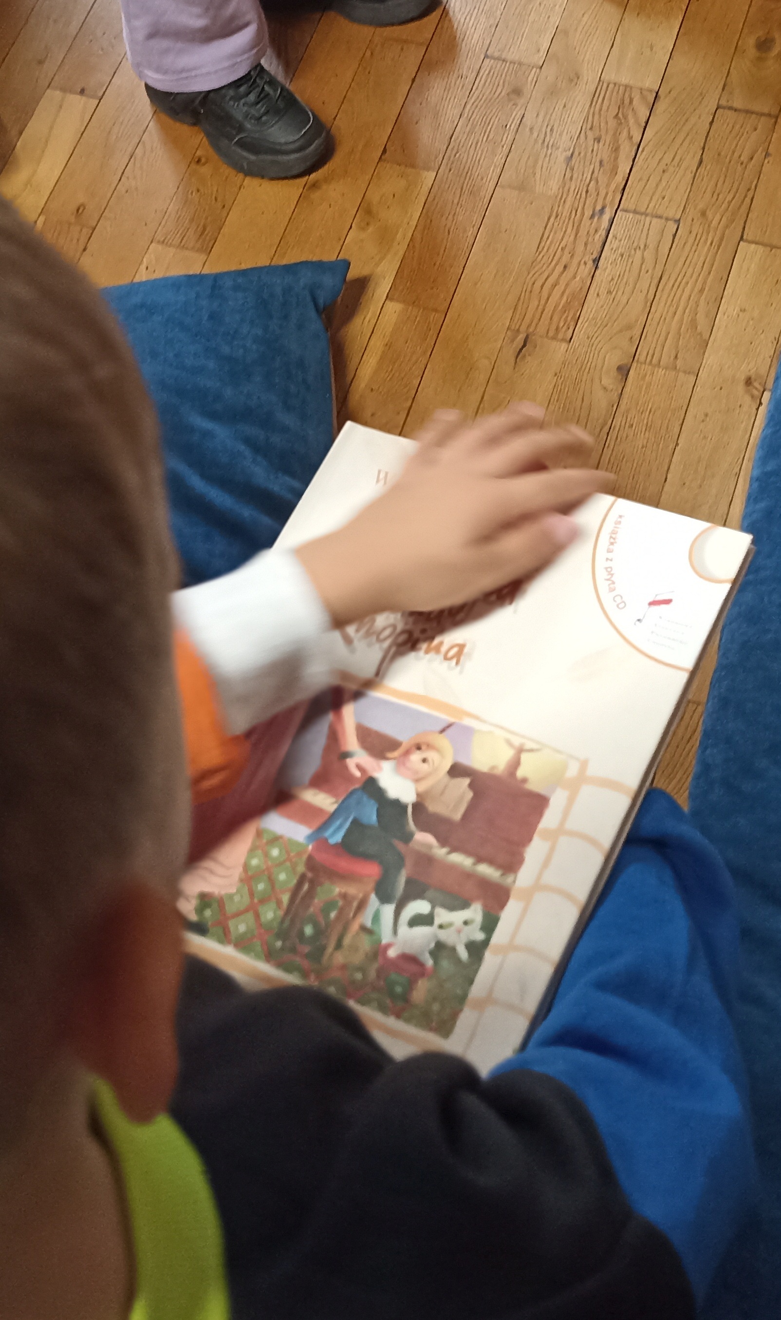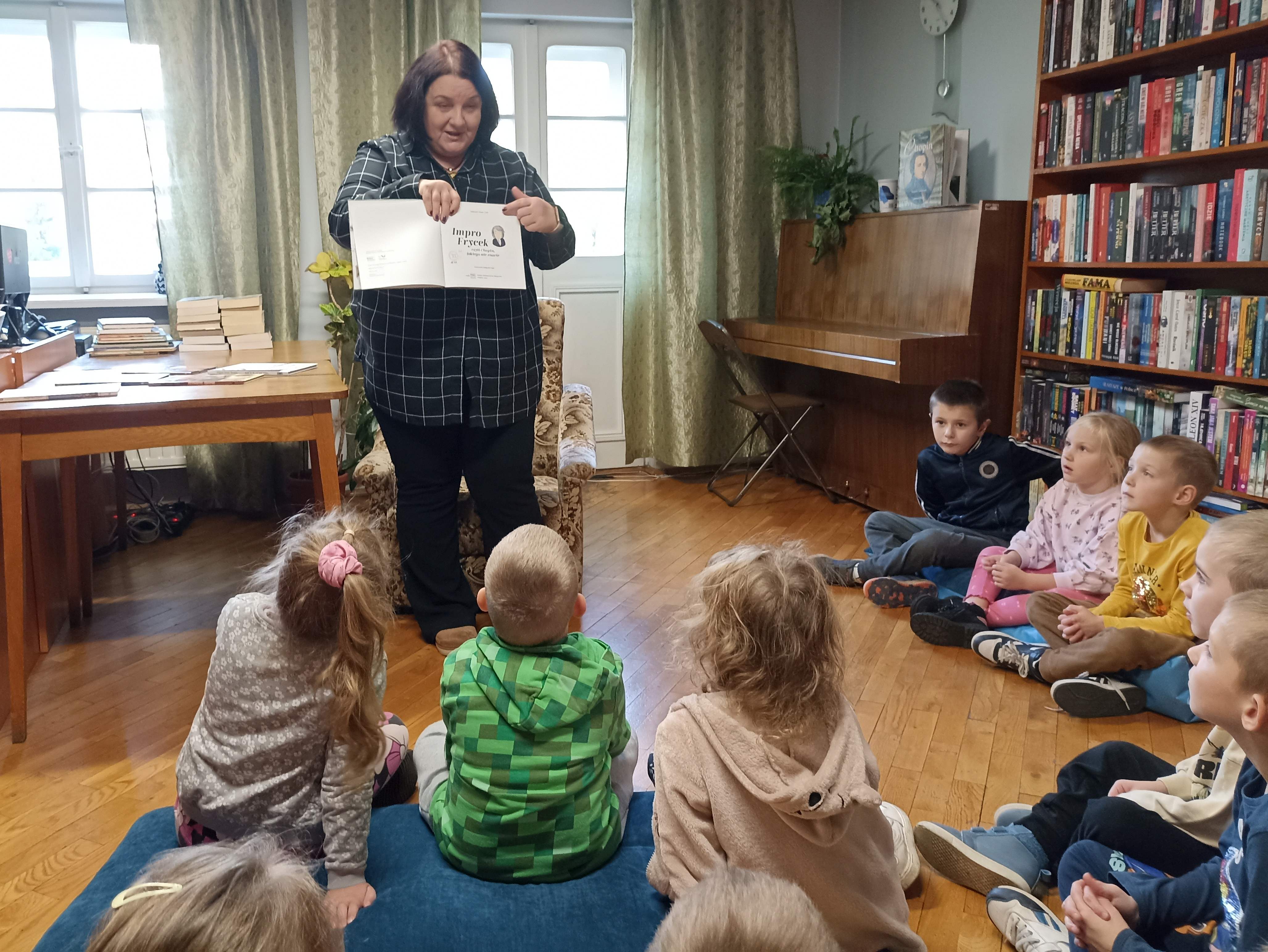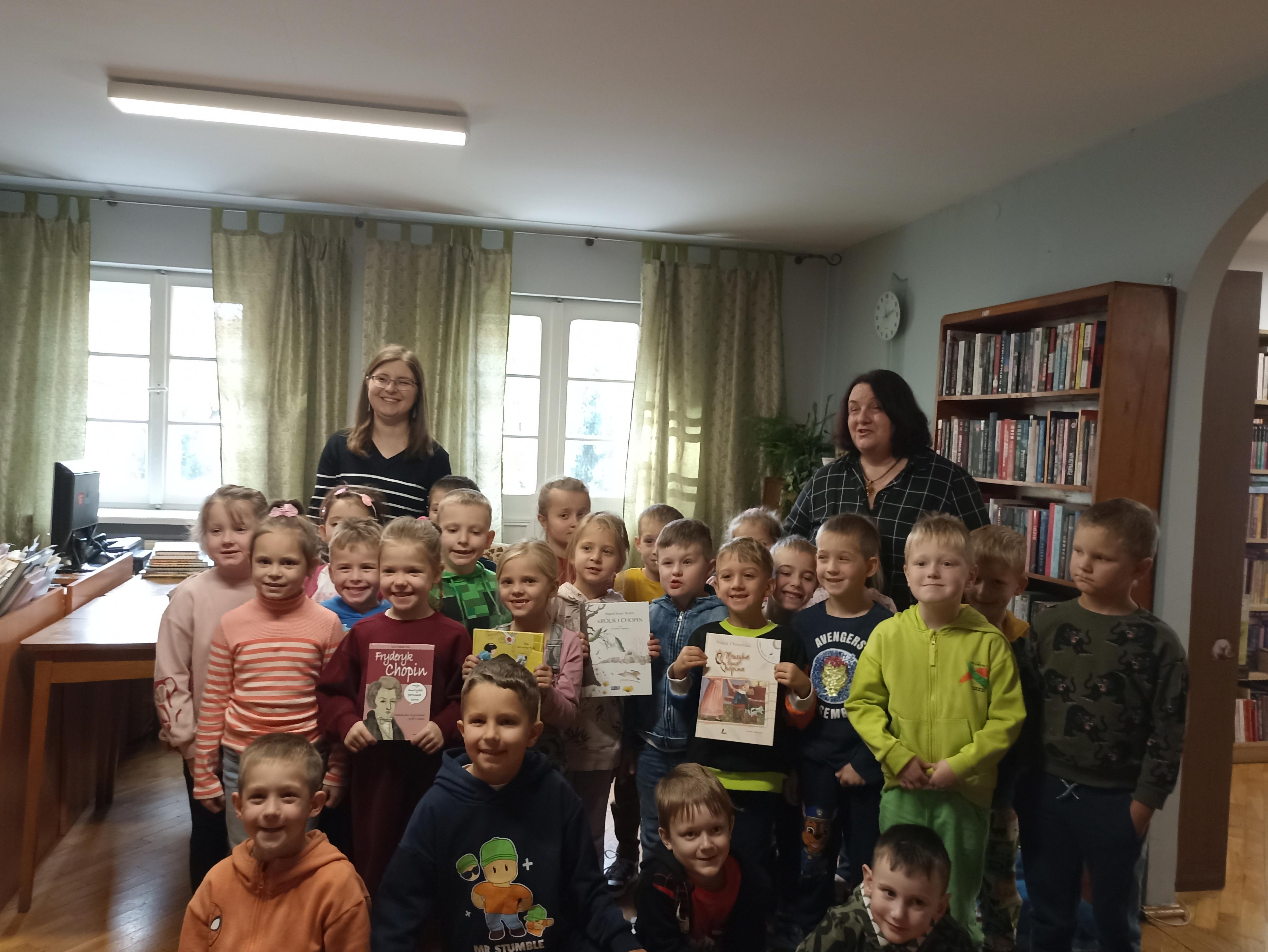 Pani bibliotekarka przeczytała również przedszkolakom fragmenty książki o Fryderyku Chopinie pt. „Impro Frycek”. Następne dzieci posłuchały kilku znanych utworów tego wybitnego kompozytora.