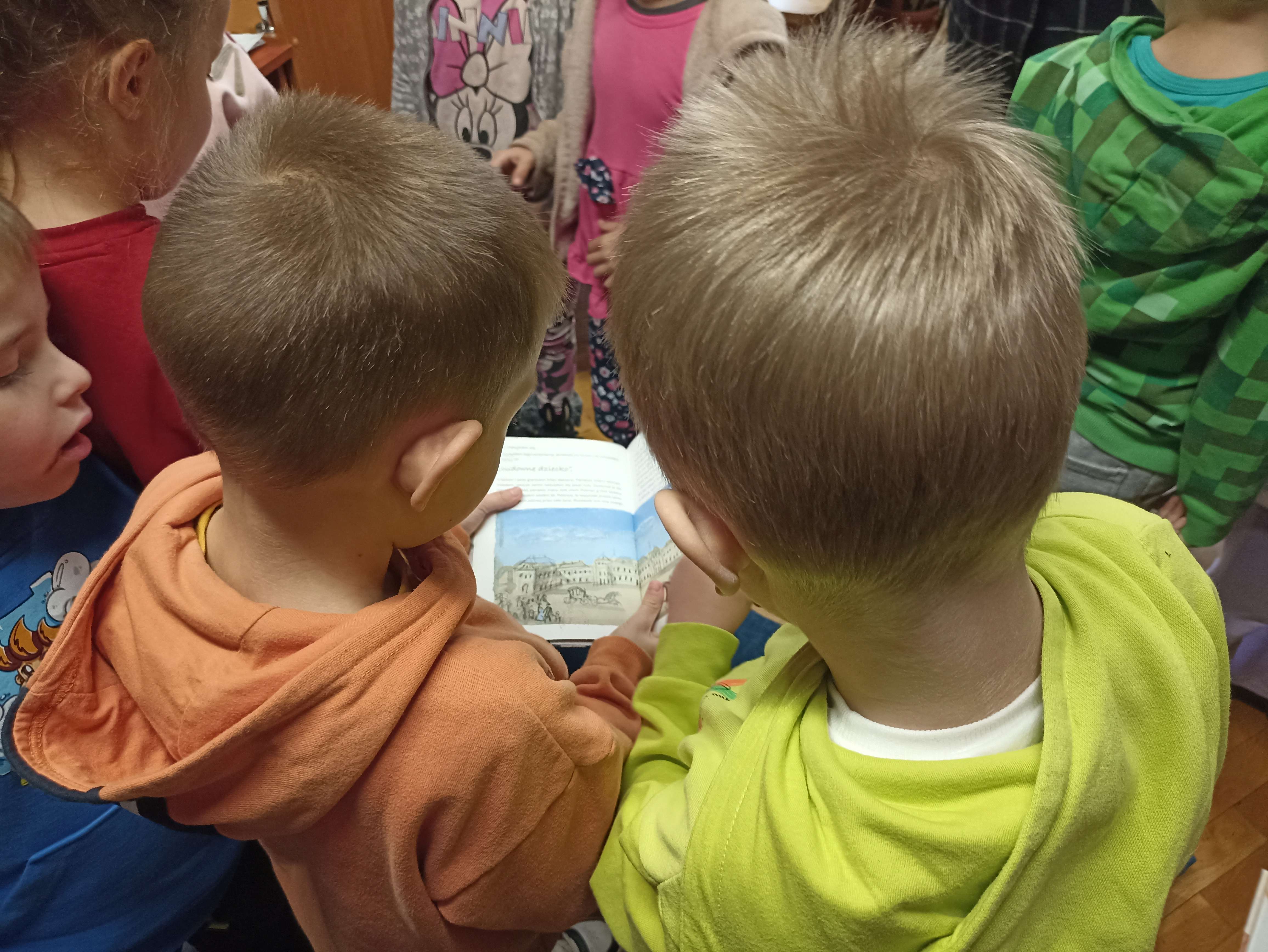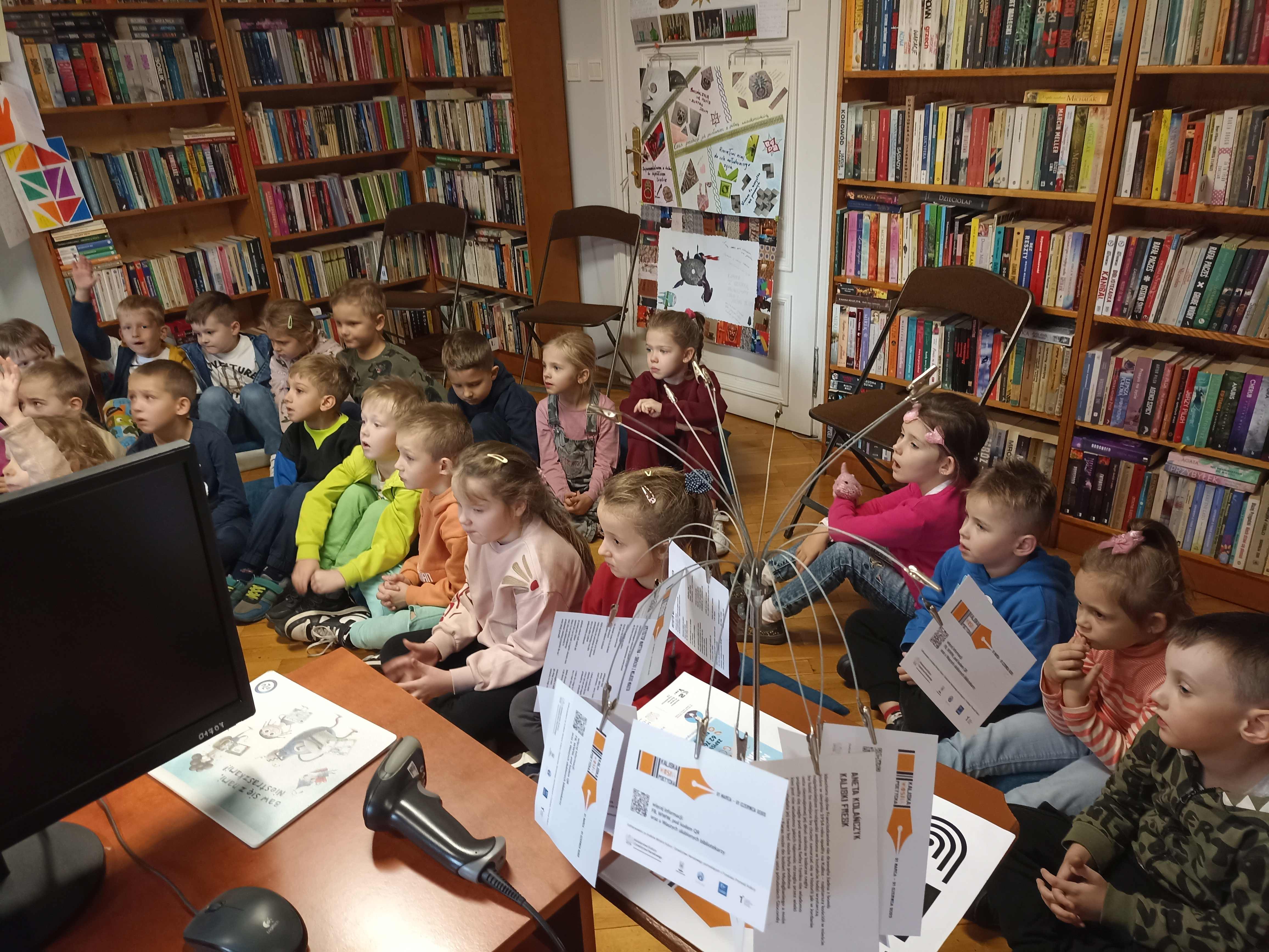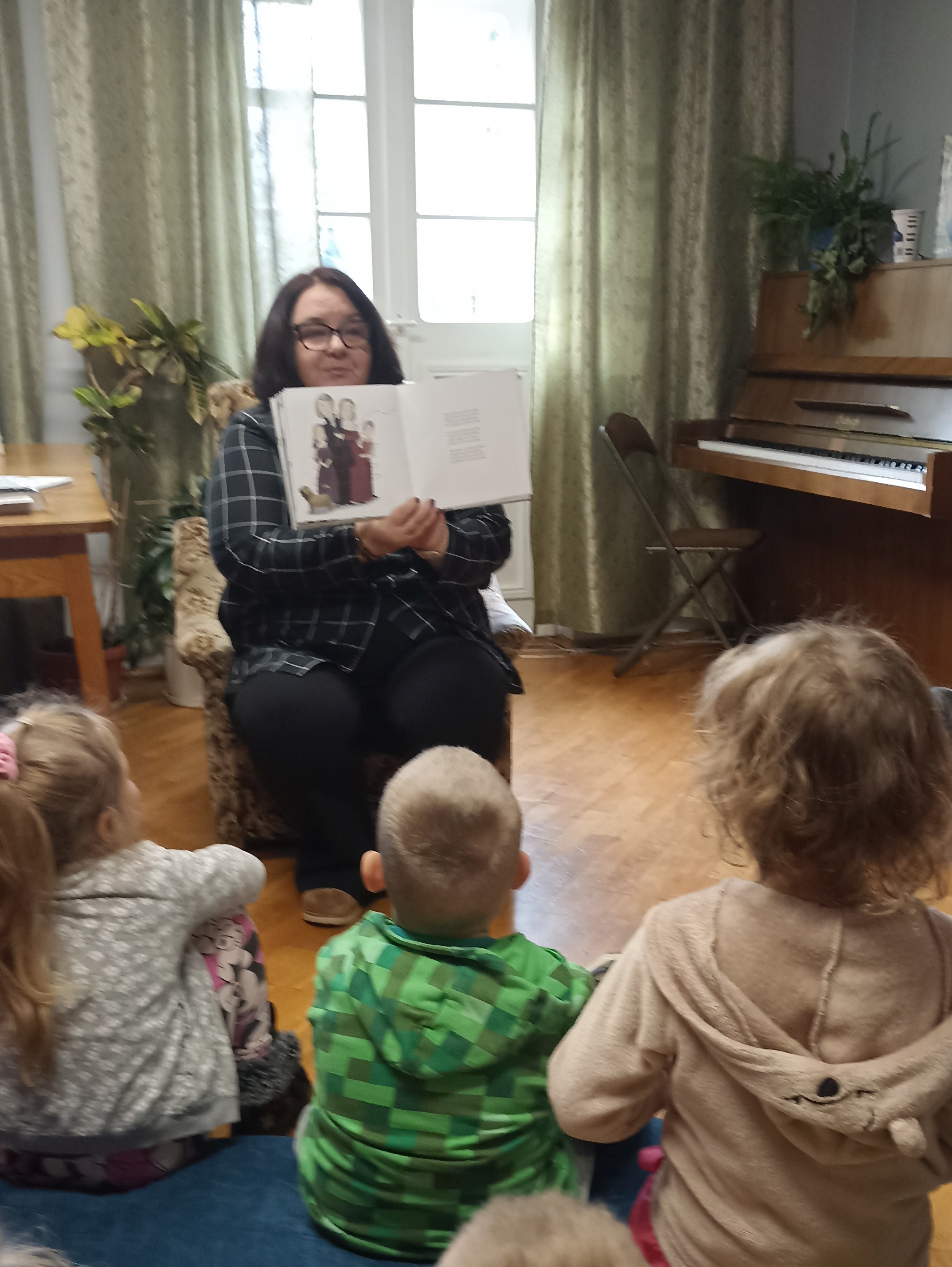 Pani bibliotekarka przeczytała również przedszkolakom fragmenty książki o Fryderyku Chopinie pt. „Impro Frycek”. Następne dzieci posłuchały kilku znanych utworów tego wybitnego kompozytora.