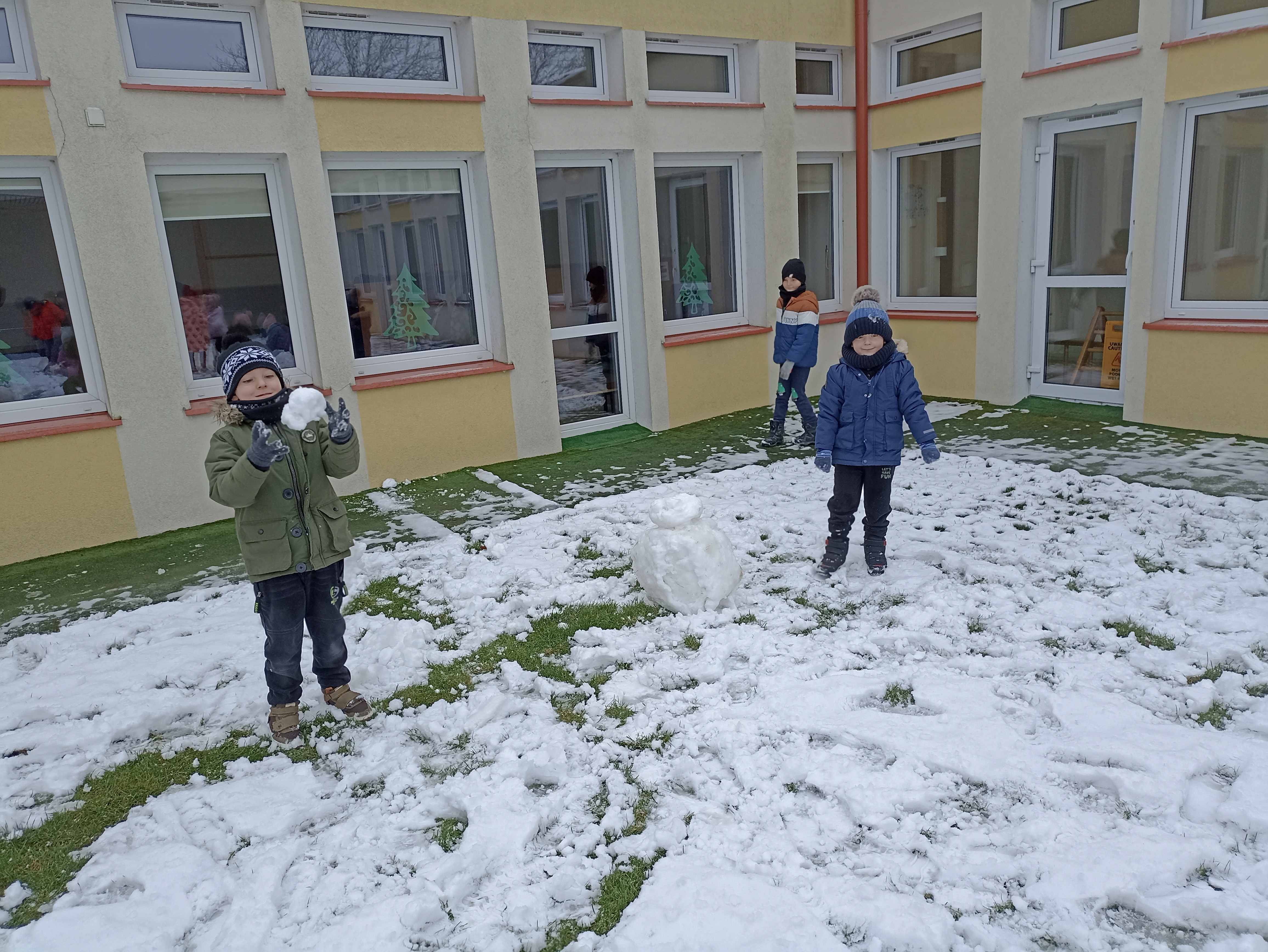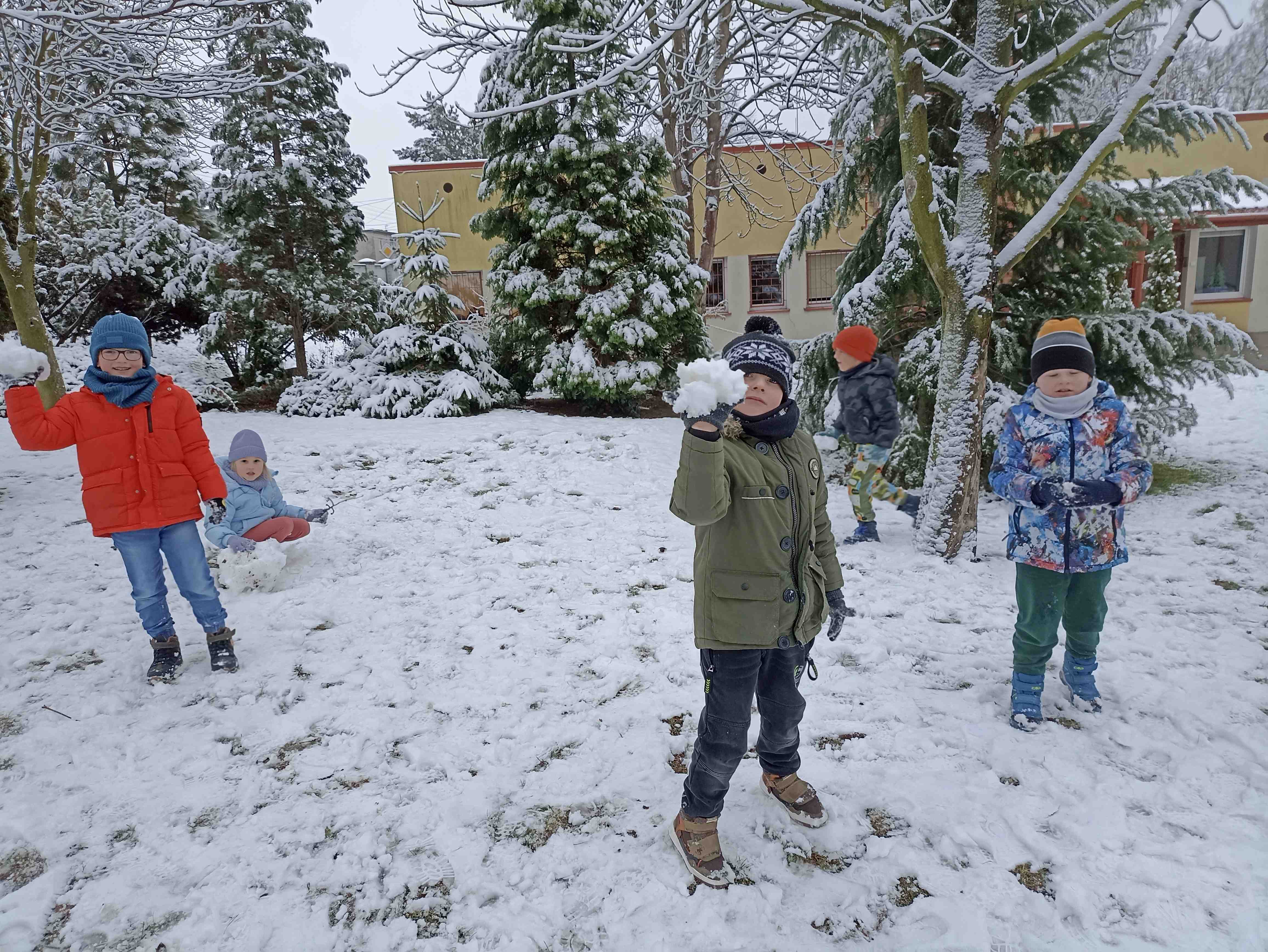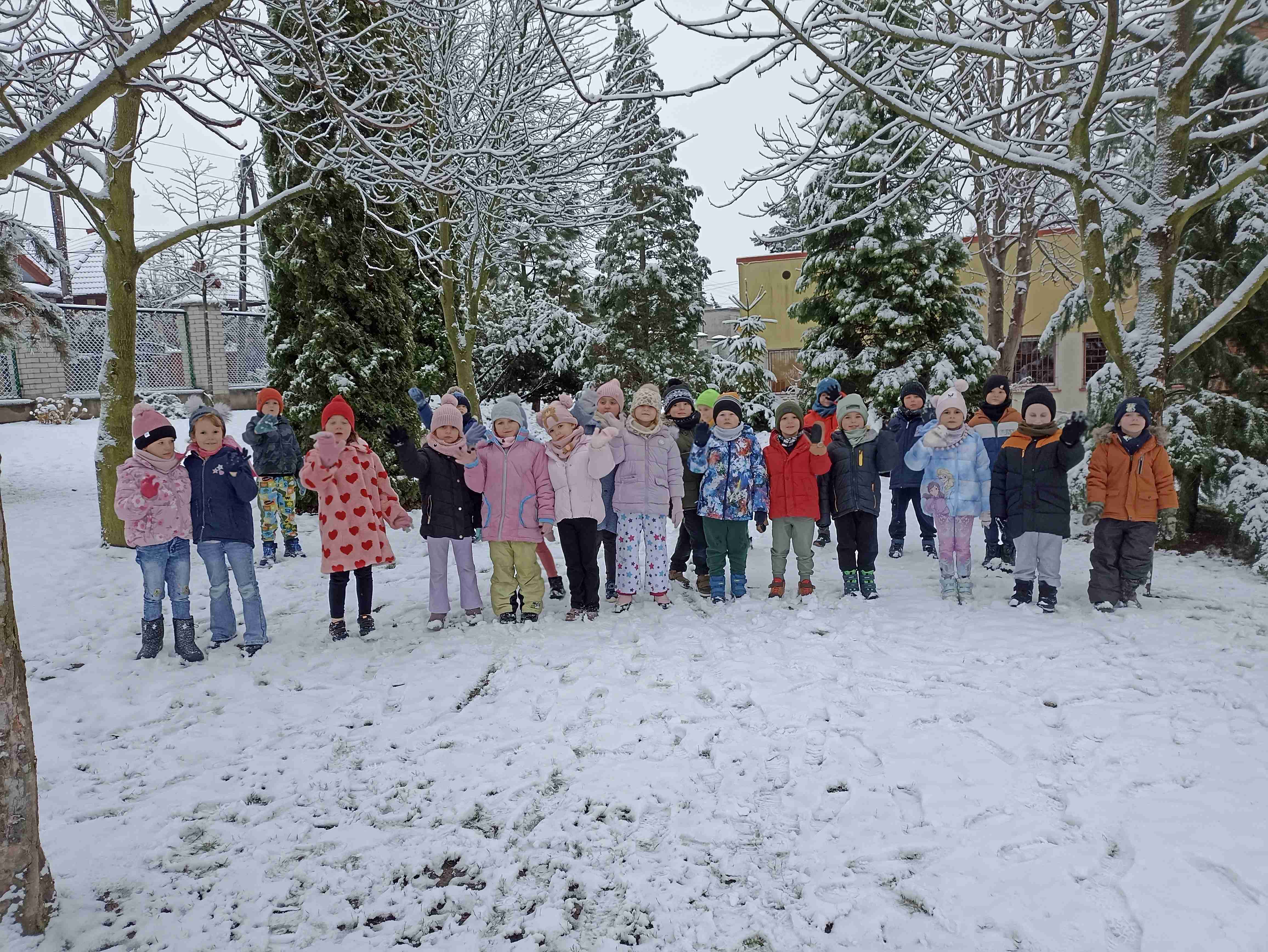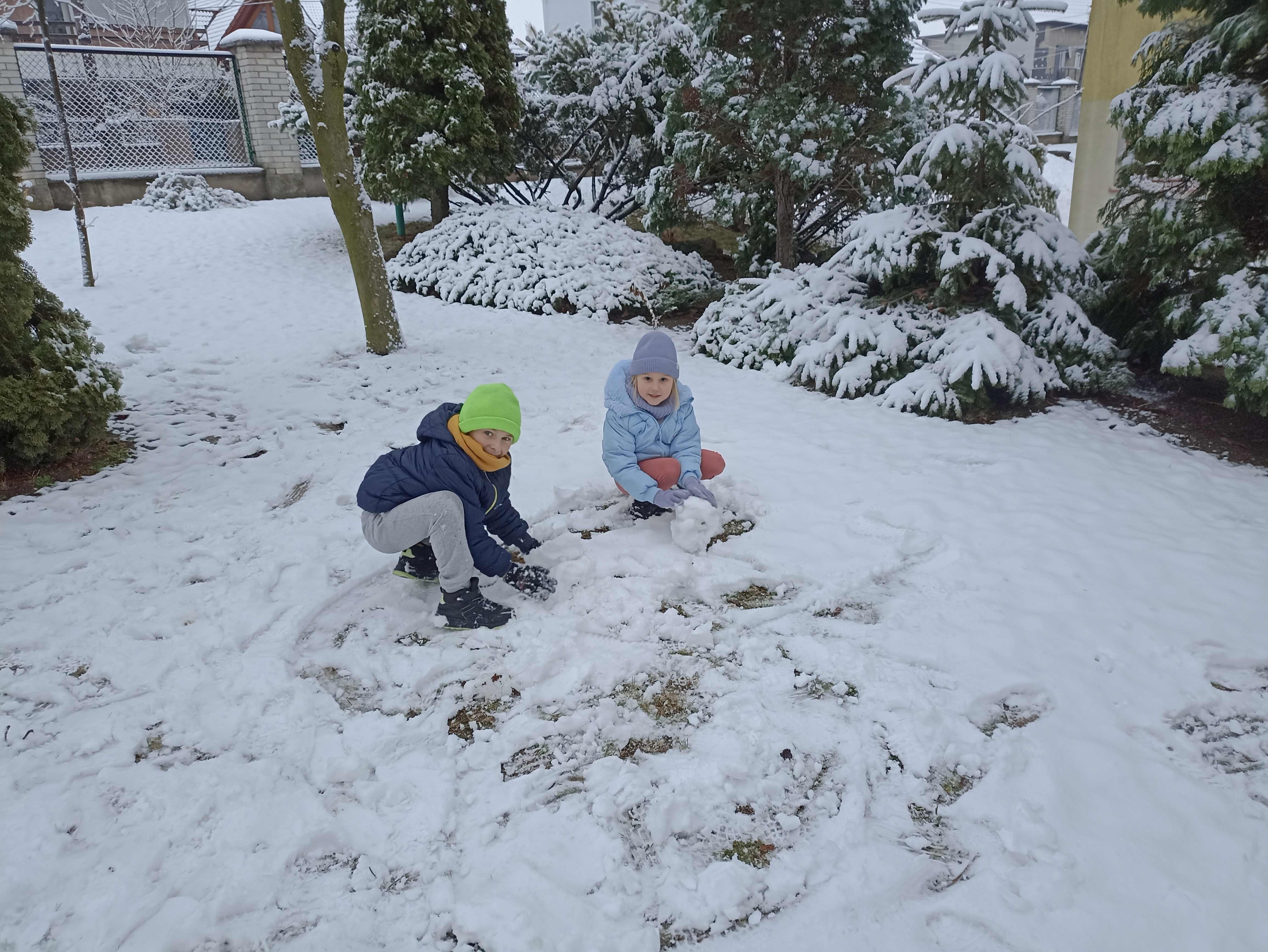 Pierwszy śnieg przyniósł dzieciom mnóstwo radości! Wykorzystując zimową aurę, przedszkolaki przez kilka dni aktywnie spędzały czas na świeżym powietrzu.