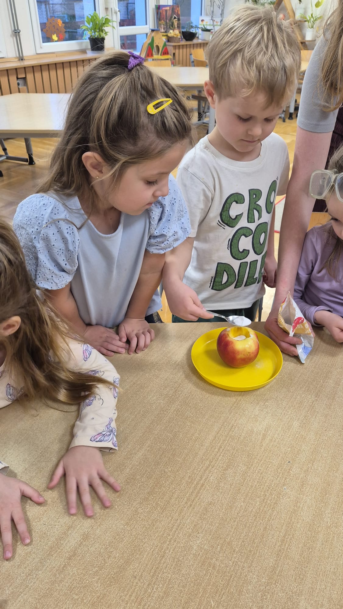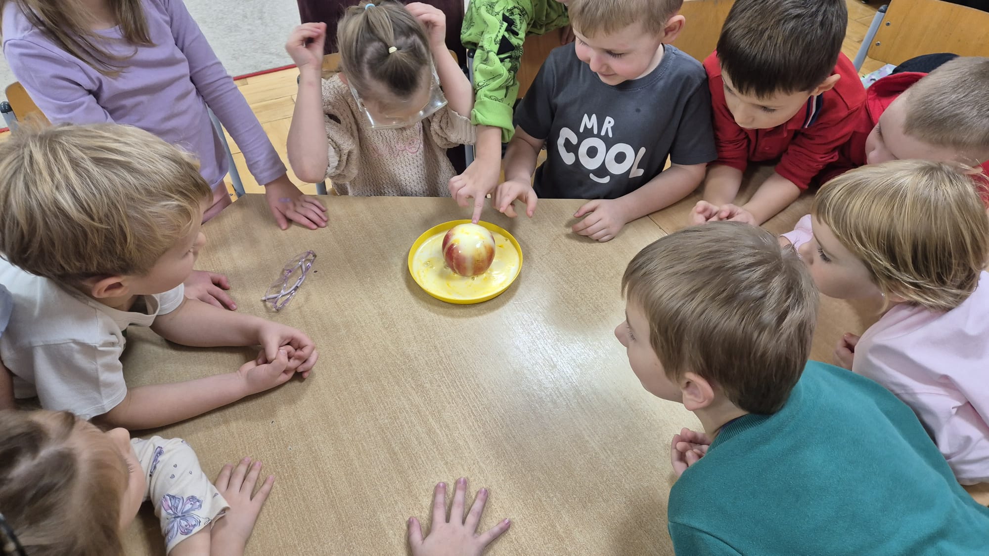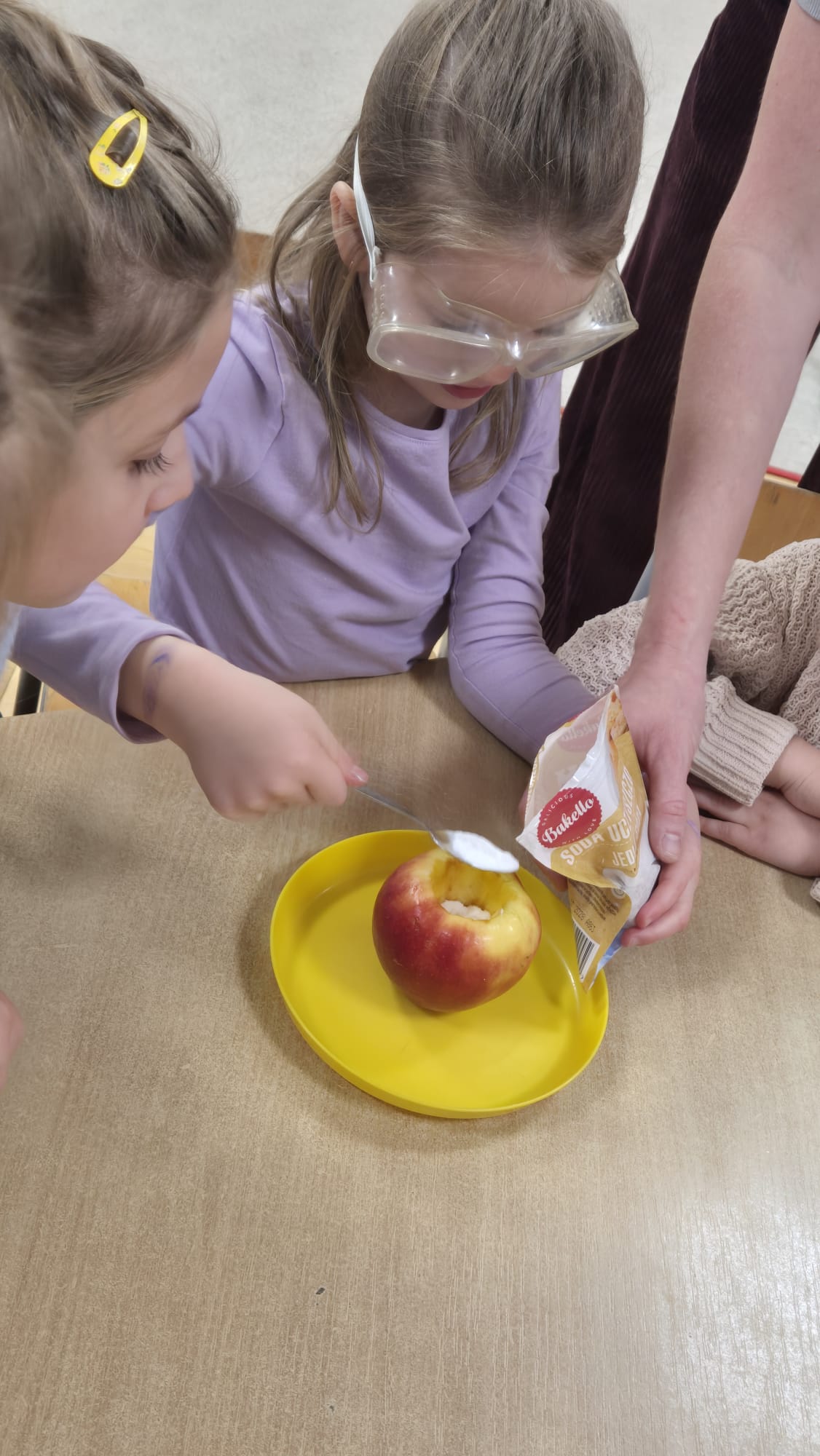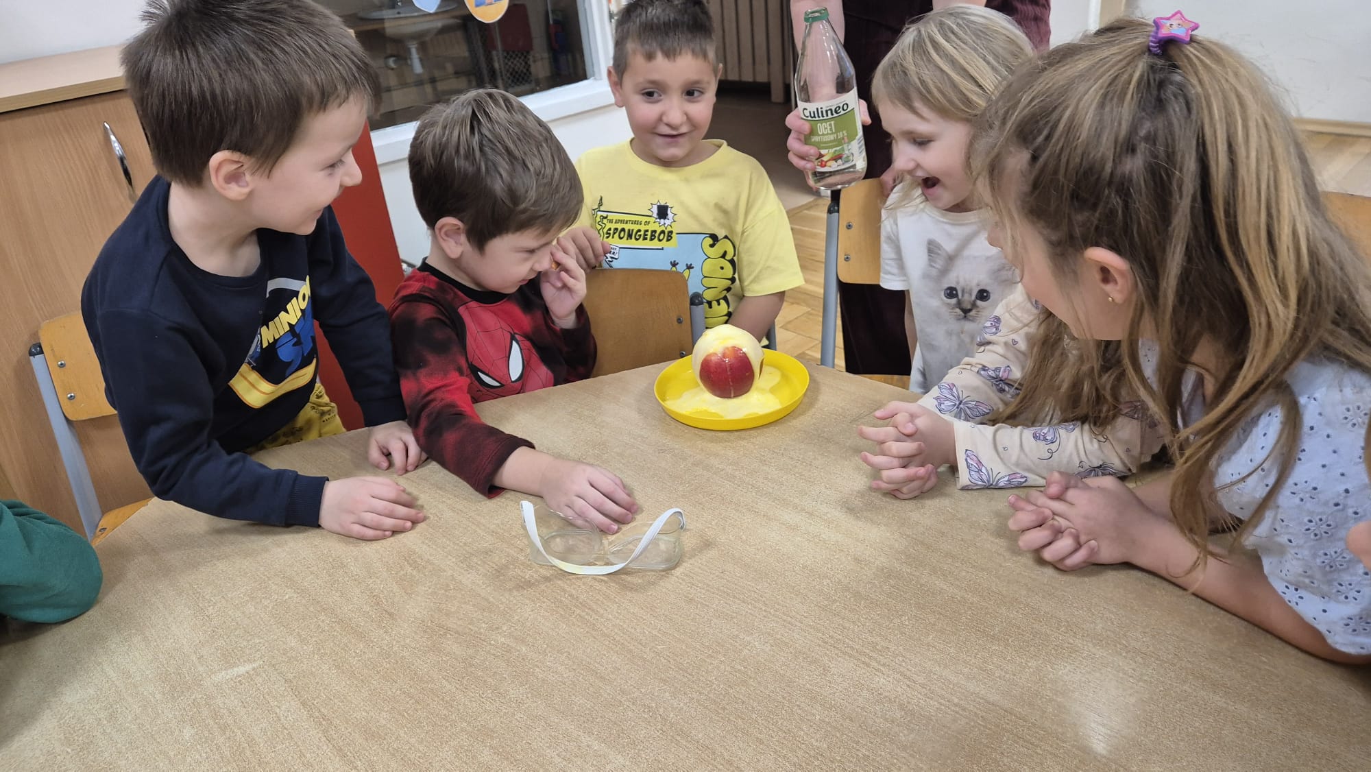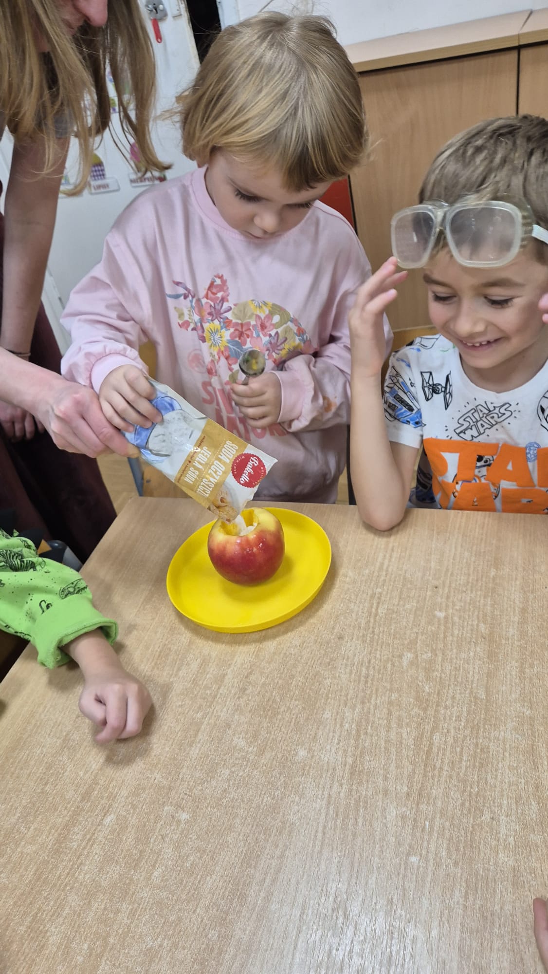 Rozmawiały o jesieni, o tym jak zmienia się przyroda i jak zwierzęta przygotowują się do zimy. Dzieci eksperymentowały z jabłkiem, sodą i octem. Wszystko doskonale się udało.