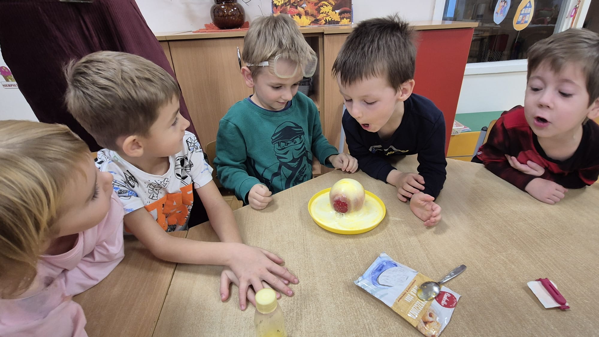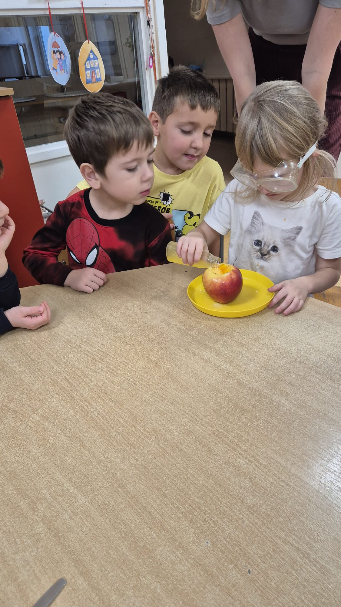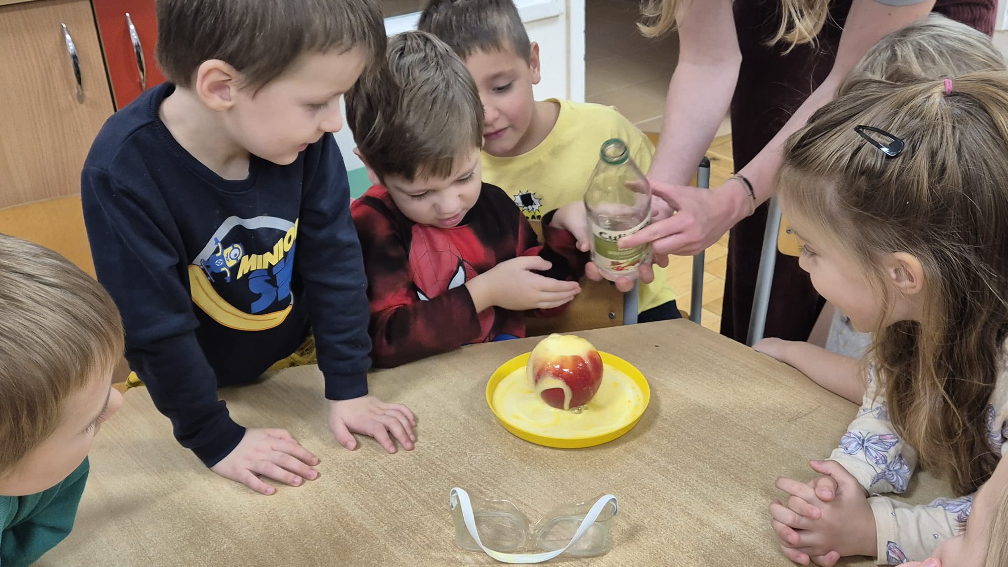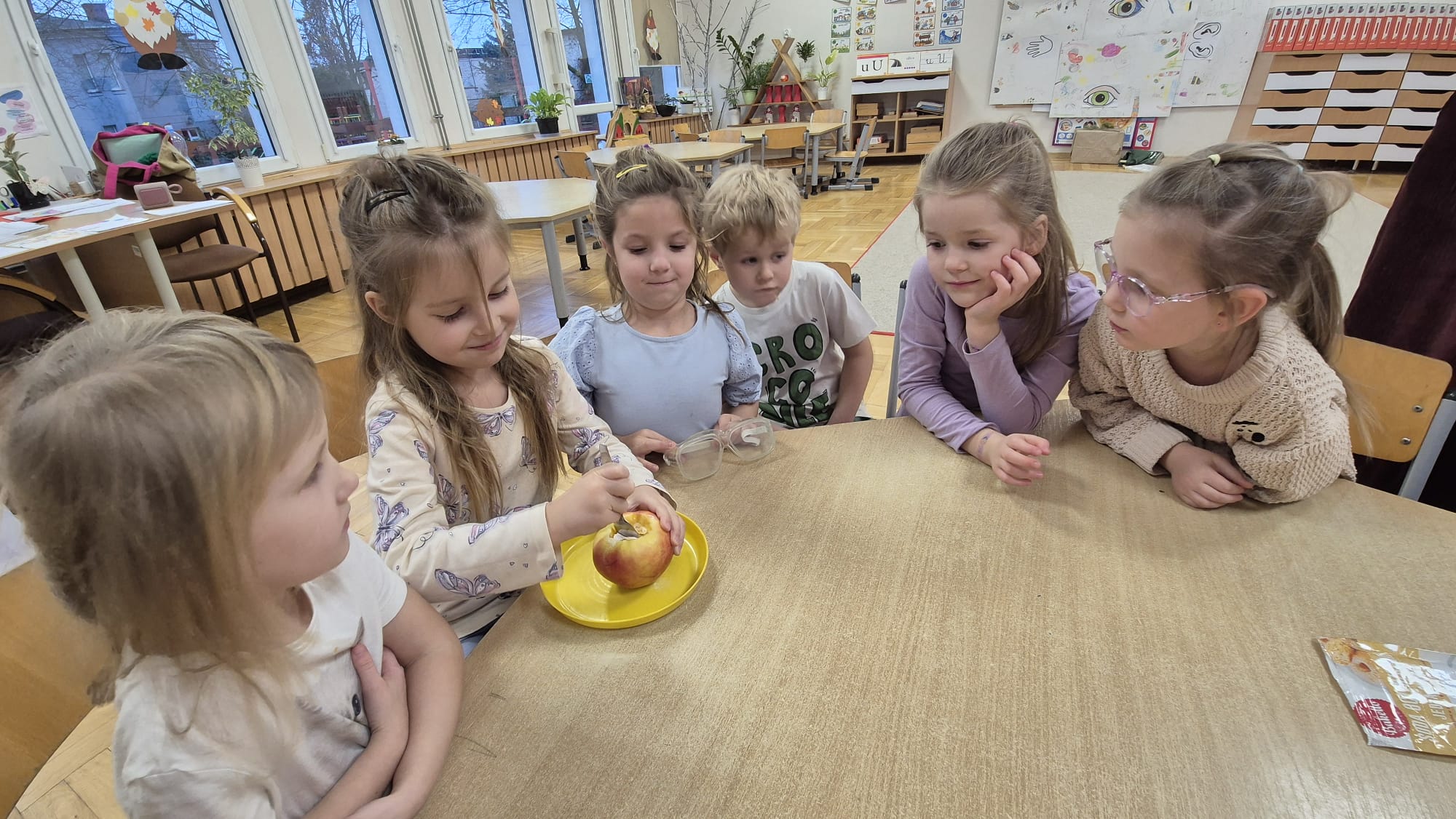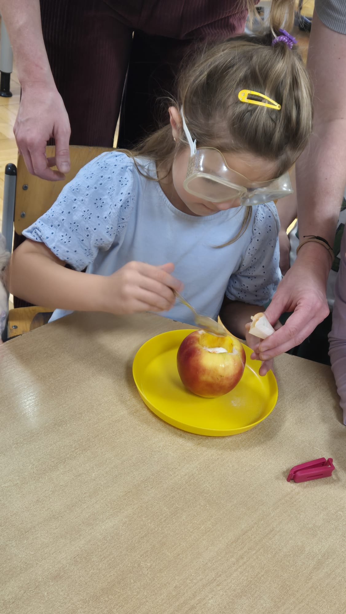 Rozmawiały o jesieni, o tym jak zmienia się przyroda i jak zwierzęta przygotowują się do zimy. Dzieci eksperymentowały z jabłkiem, sodą i octem. Wszystko doskonale się udało.
